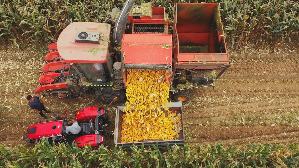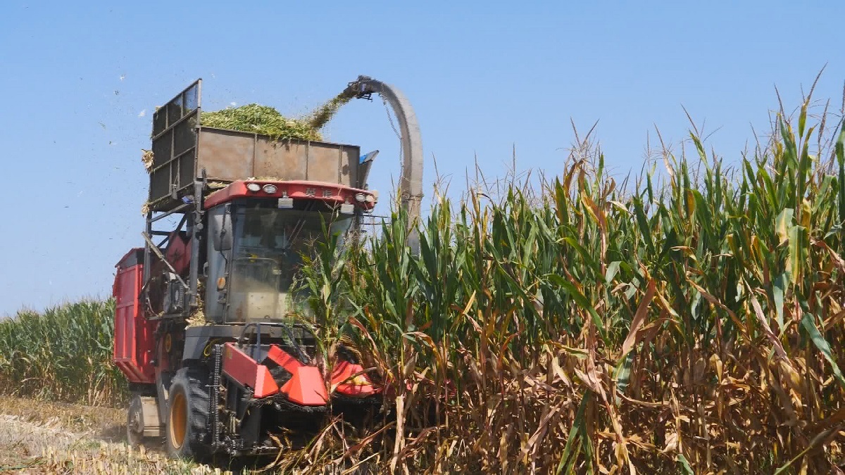 茎穗兼收玉米收割机正在作业。杜得天 摄