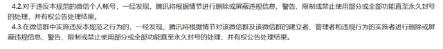 在微信群中实施违规行为的,“腾讯将根据情节对该微信群及该微信群的建立者、管理者和违规行为的实施者进行删除或屏蔽违规信息、警告、限制或禁止使用部分或全部功能直至永久封号的处理,并有权公告处理结果”。