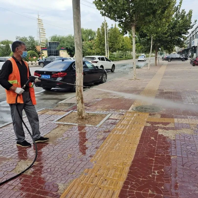 环卫工人冲洗路面。故城县融媒体中心供图