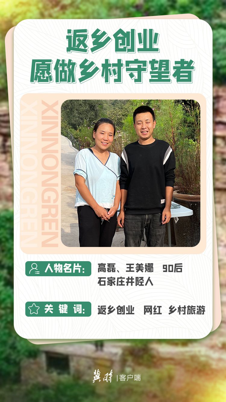高磊夫妇利用青山绿水,在大山里开办度假民宿,带动村民在家门口实现就业。目前,他们经营着10个度假民宿,以及2个度假小院,能同时接待游客数百人。高磊夫妇有一个新梦想,他们想要把乡亲们的老石窑和特色农产品整合成资源推向全国,继续带动乡亲们增收致富,为乡村振兴贡献青春力量。
