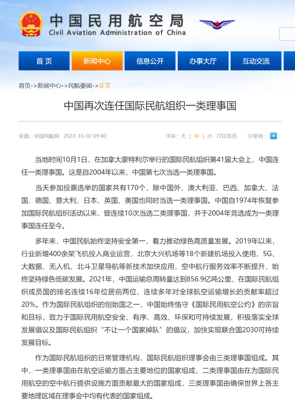 当地时间10月1日,在加拿大蒙特利尔举行的国际民航组织第41届大会上,中国连任一类理事国。这是自2004年以来,中国第七次当选一类理事国。