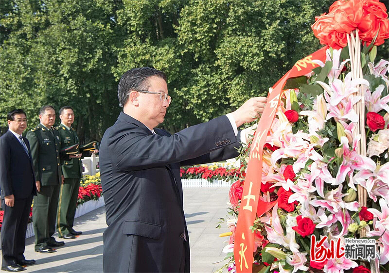省直有关单位主要负责同志,省各民主党派专职副主委、省工商联主要负责同志和无党派人士代表,石家庄市四大班子成员,老战士和烈士家属代表,公安干警代表,省会各界群众代表、中学生和少先队员代表等参加敬献花篮仪式。