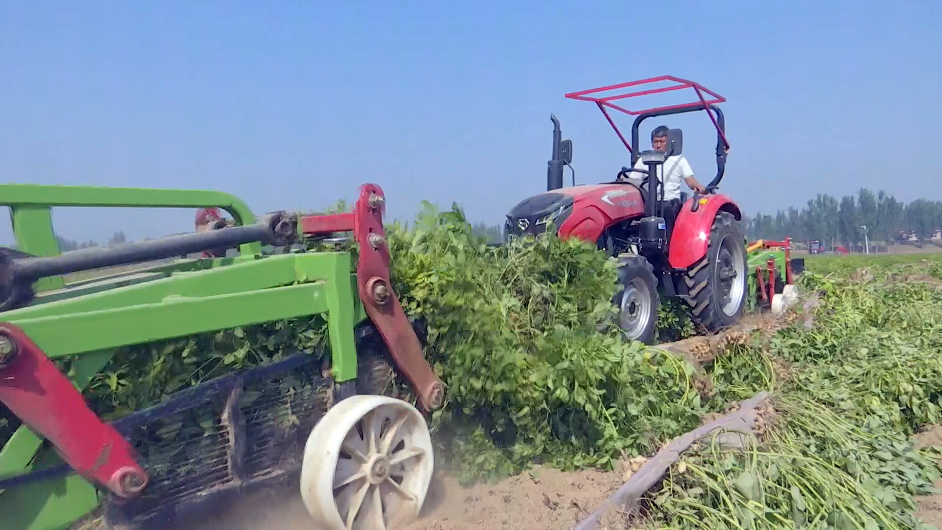 近日,在衡水市安平县大何庄乡报子营村的高油酸花生种植基地,花生收获机来回穿梭忙着收获花生。据悉,2022年,当地每亩高油酸花生产量能达到1000斤左右,丰收的幸福写在农民的笑脸上。