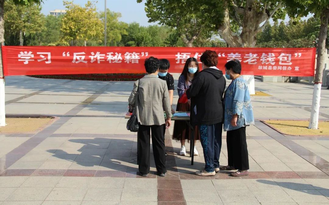 为深入推进打击整治养老诈骗专项行动走深走实,提高老年人对养老诈骗行为的辨别能力,为迎接党的二十大胜利召开营造平安稳定的网络环境,9月29日,故城县委网信办在龙湖公园开展了“九九重阳寄深情,养老反诈送安心”宣传活动。