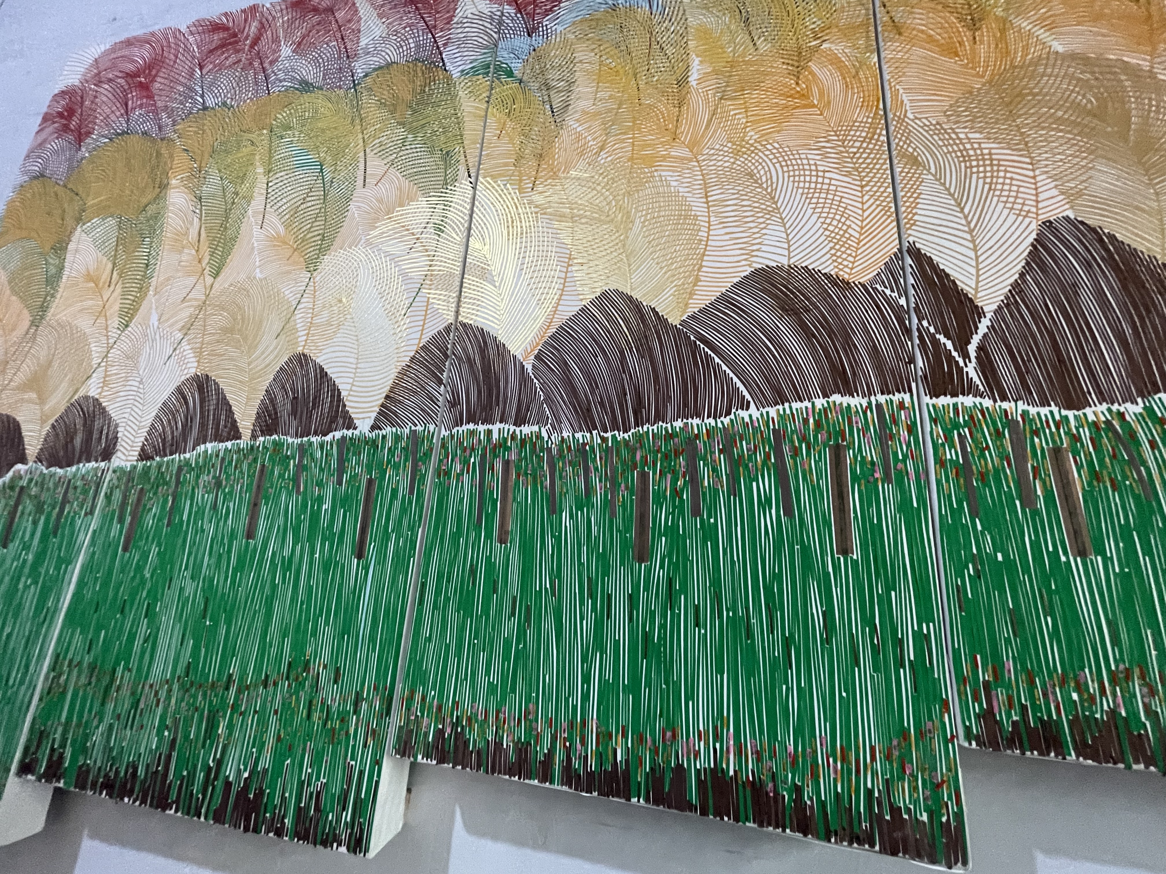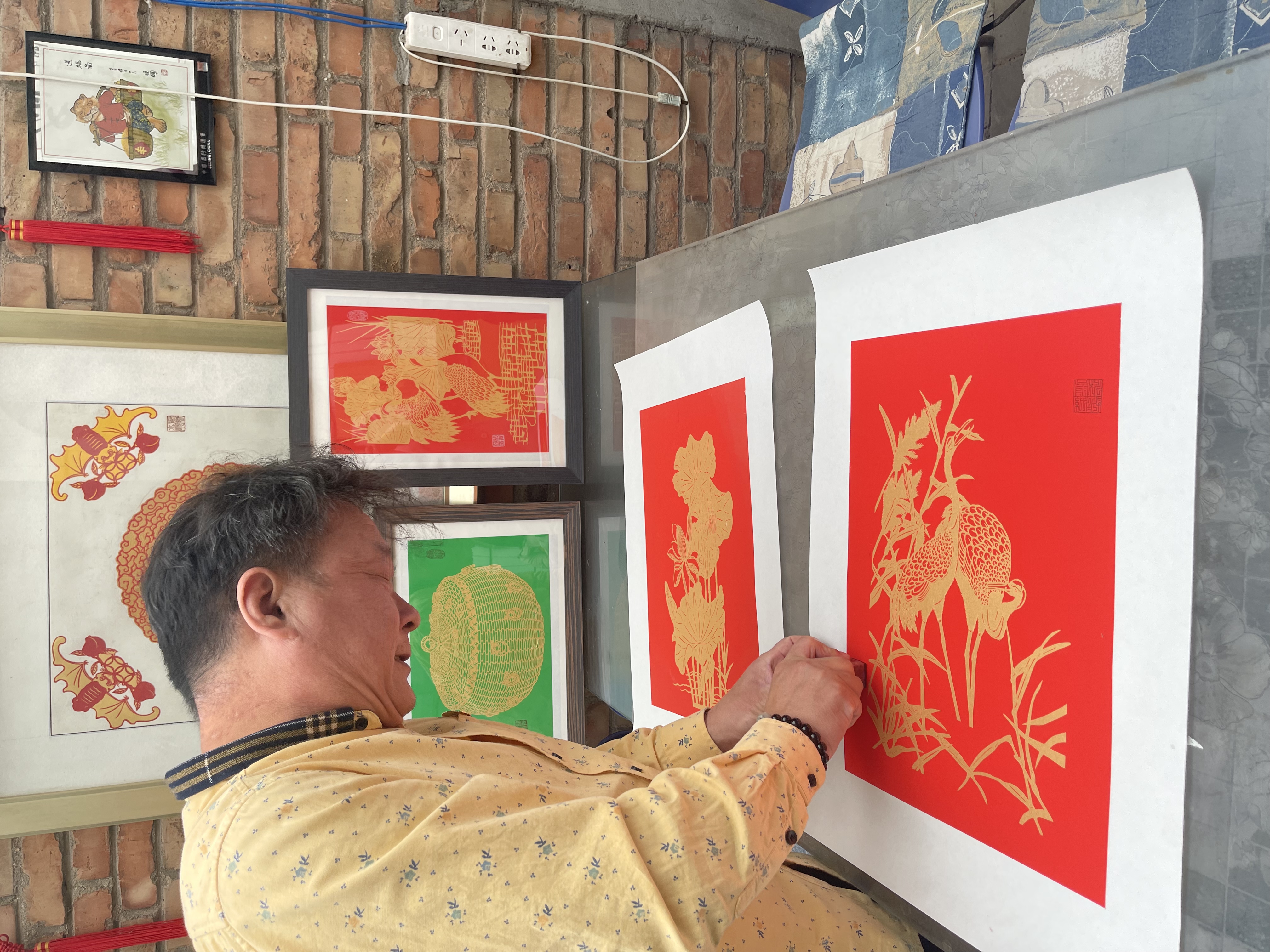 走进秘青亚的剪纸小院,记者便被院子里各式各样的剪纸作品所吸引,既有传统的窗花剪纸,也有彩色拼接线条的创意剪纸,尤其是在创作室墙上挂着的一副巨型蒲草剪纸作品,充满独特意境。这张拼接而成的剪纸木板上,红色、粉色、绿色、金色的剪纸线条,层层叠加,勾勒出衡水湖水草、蒲草、芦花等元素,一眼看去,一簇簇、一丛丛,让人仿佛置身于衡水湖畔,感受着秋风拂面、水草摇曳之美。“有人建议在作品上加上一只水鸟,但我觉得这样更有意境。”秘青亚称心地说。