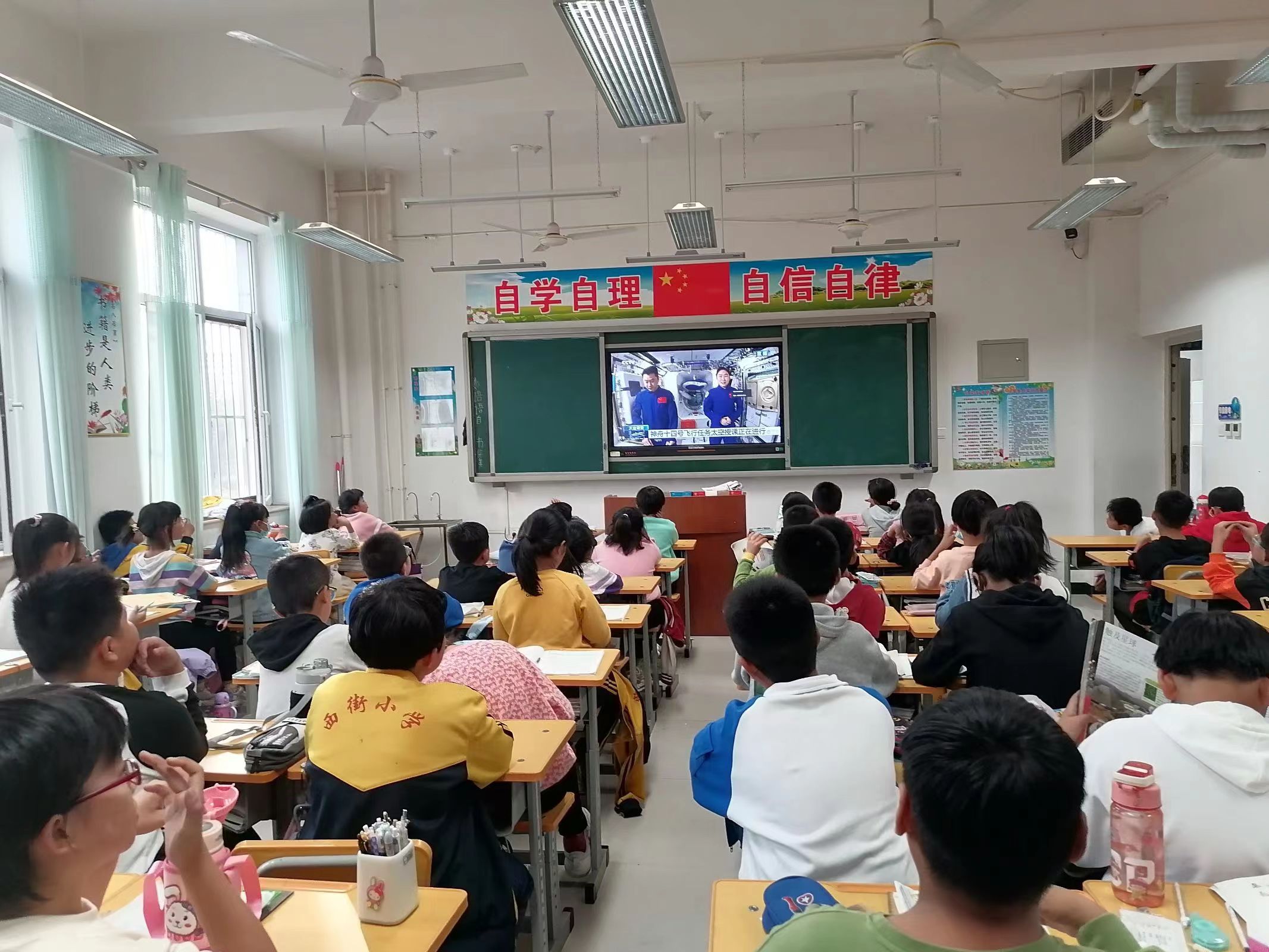 在蔡旭哲的母校,他的小学班主任、63岁的退休教师靳艳娥特地赶来,和孩子们一起观看了“天宫课堂”。她向孩子们讲述了成绩优秀、乐于助人蔡旭哲。“孩子们,载人航天的未来需要你们,科学探索的事业更需要你们,希望你们胸有山海,眼有星辰,脚踏实地,共同创造更加精彩的未来。”她勉励孩子们好好学习,将来也成为祖国栋梁。蔡旭哲的姐姐也在此任教,她说:“这种授课方式非常好,启发了孩子们的好奇心,增强了对科学的兴趣,培养了孩子们的太空梦想。”学生们聚精会神地倾听,全神贯注地观看,并动手同步做毛细效应等实验,感叹航天科技的神奇。直播结束后,同学们意犹未尽,小声和同桌讨论对太空微重力的见解,表达对航天事业的向往。