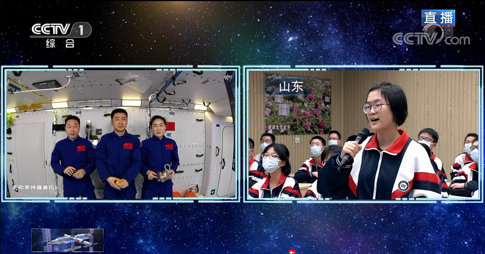 中央广播电视总台面向全球做了现场直播。蔡旭哲的家乡深州市109所学校、6万多名中小学生兴致勃勃地观看了授课直播。深州各学校此前策划开展了航天绘画、航天梦主题作文和黑板报、航天器模型手工制作等各种主题活动,还在教室里布置了航天器模型等,营造了浓厚的氛围。深州市科协组织工作人员到各学校展示空间站模型,讲解太空知识,做火箭模拟发射,进一步激发学生们观看“天宫课堂”的兴趣和学科学、爱科学的热情以及对航天强国的自豪感。