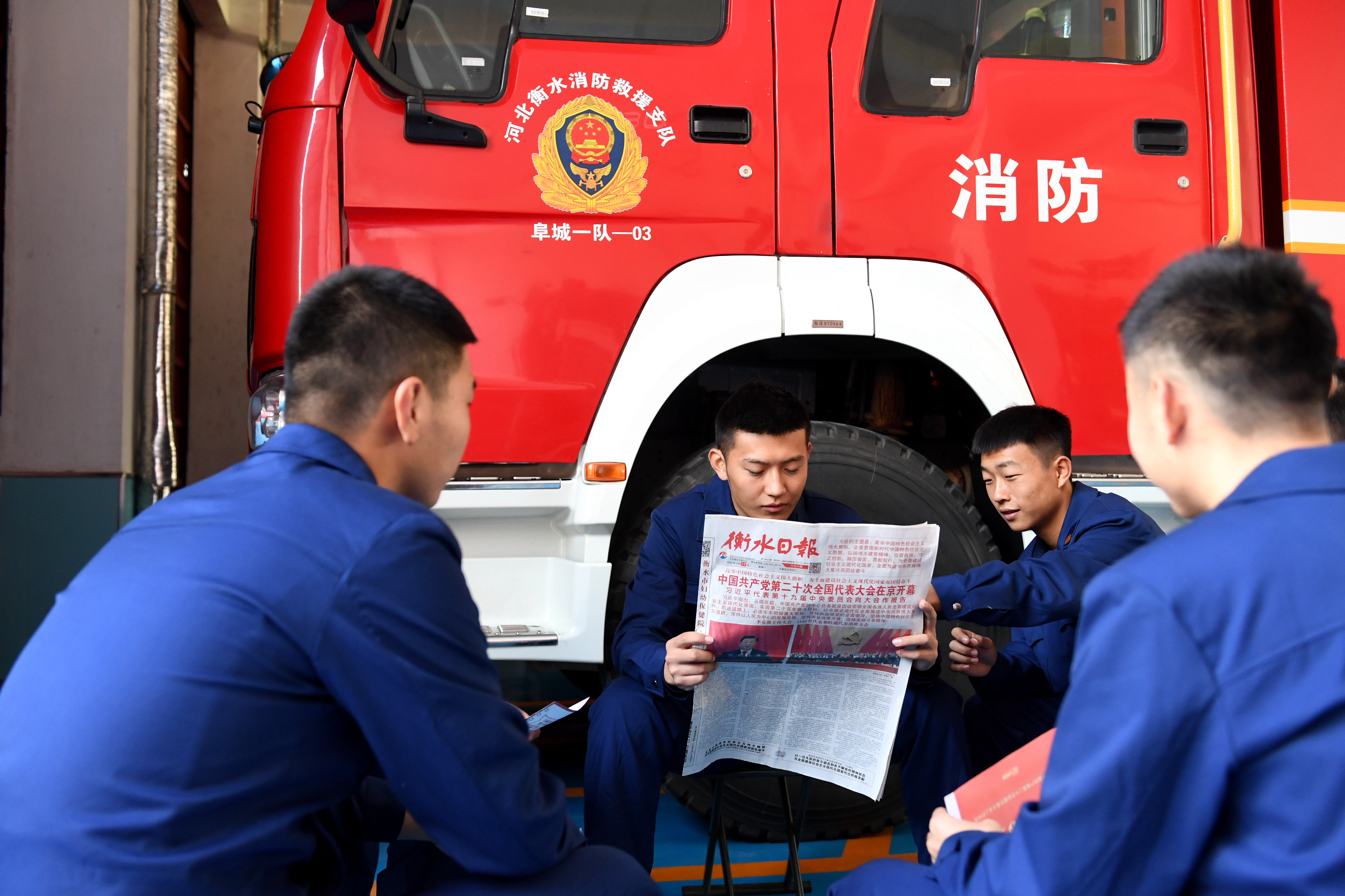 阜城县消防救援支队战斗一班学习党的二十大报告。