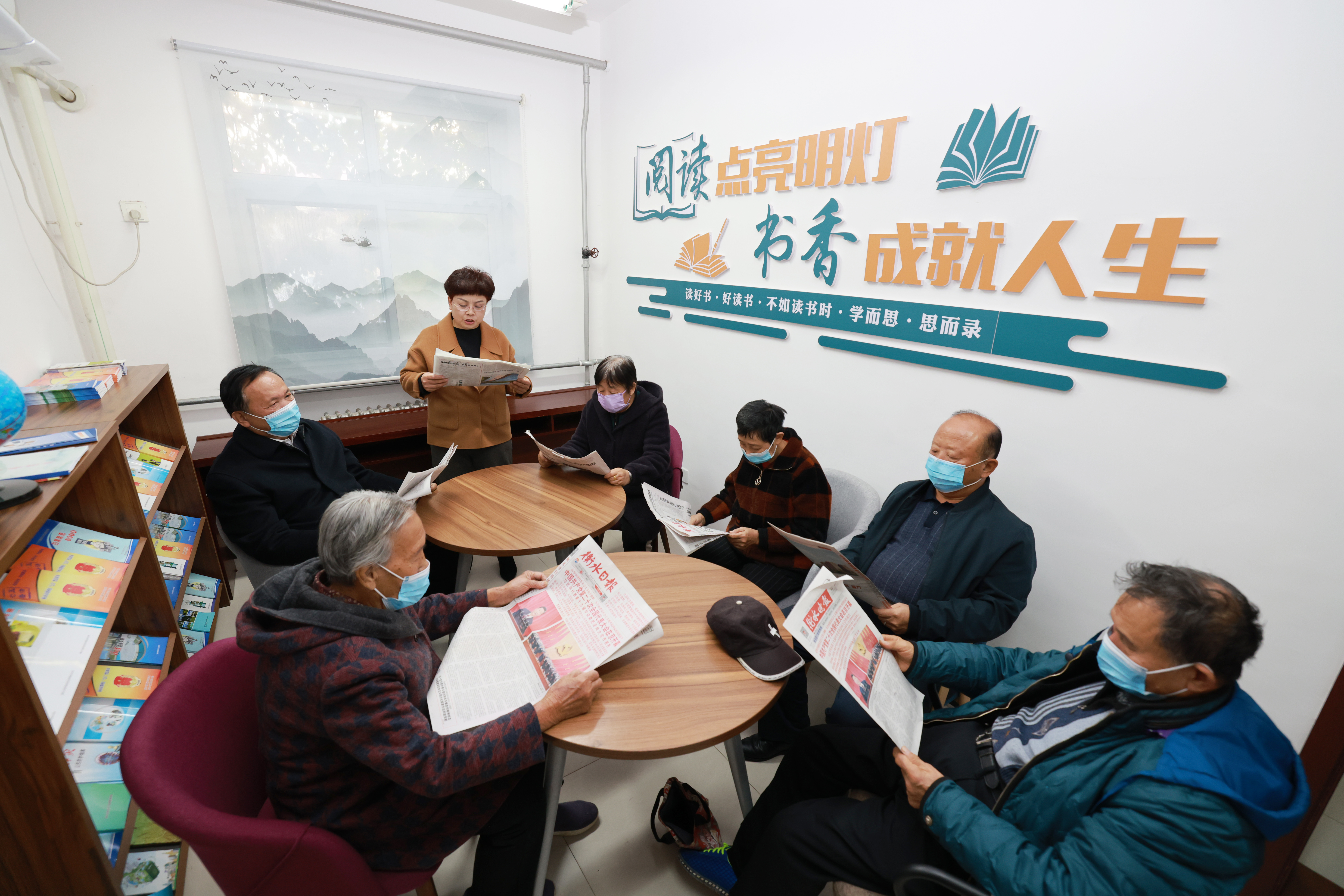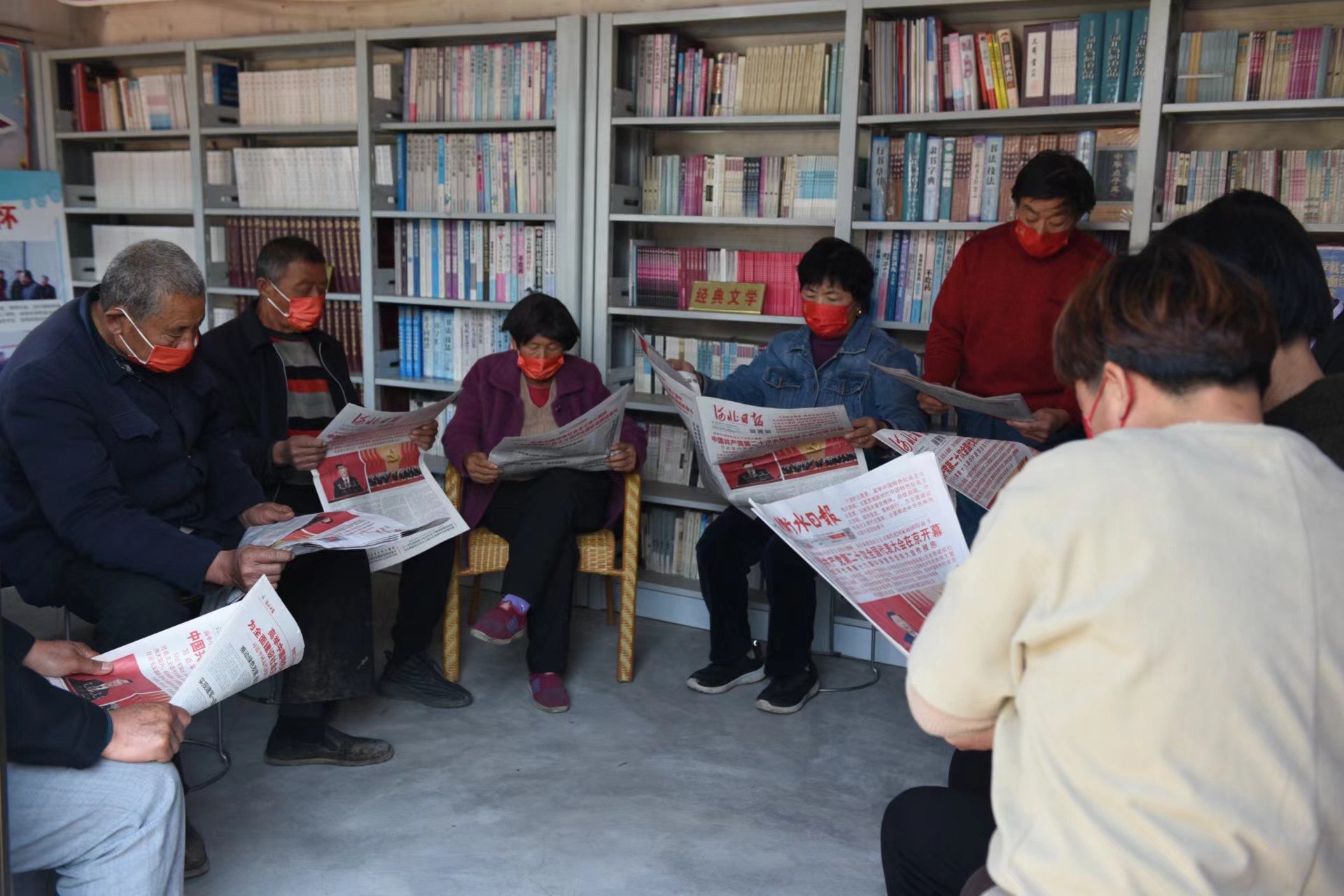深州市榆科镇乡野梨园文化大院书屋内,村民集中学习党的二十大报告。