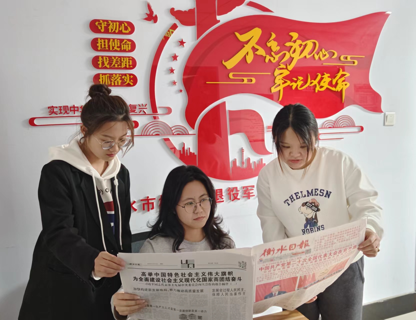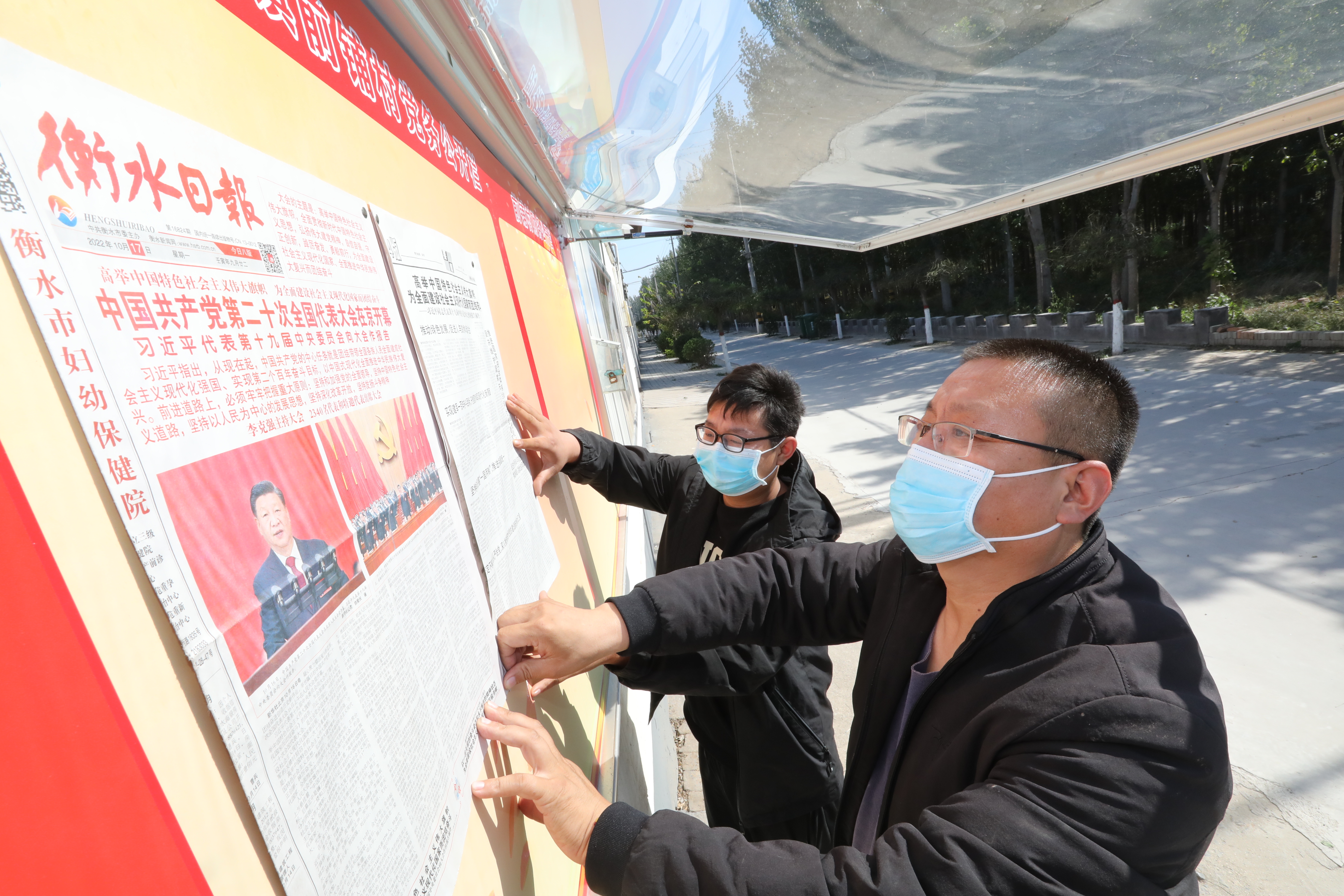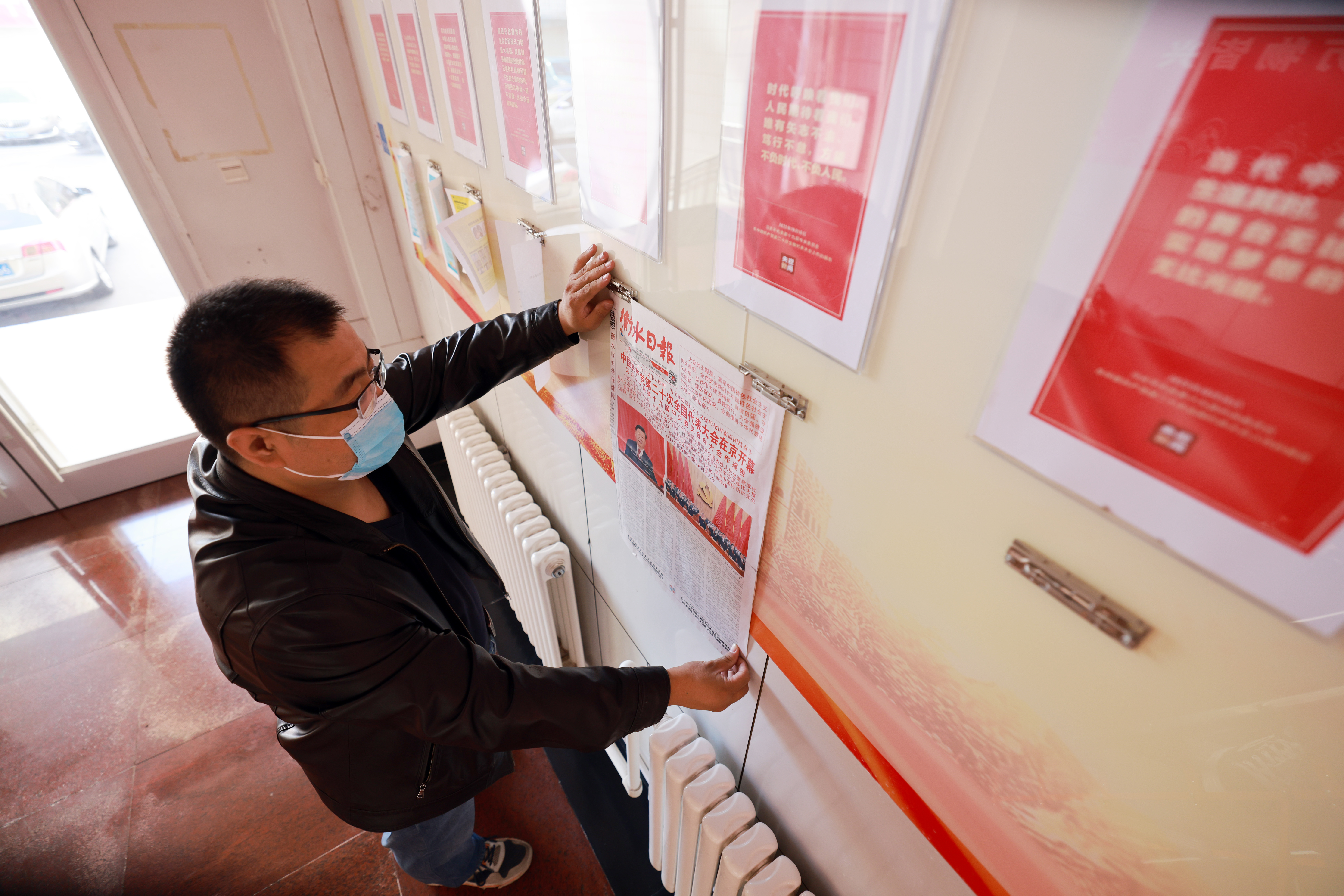 衡水市水利局工作人员将刊有党的二十大内容的《衡水日报》张贴到政务公开栏供大家阅读。