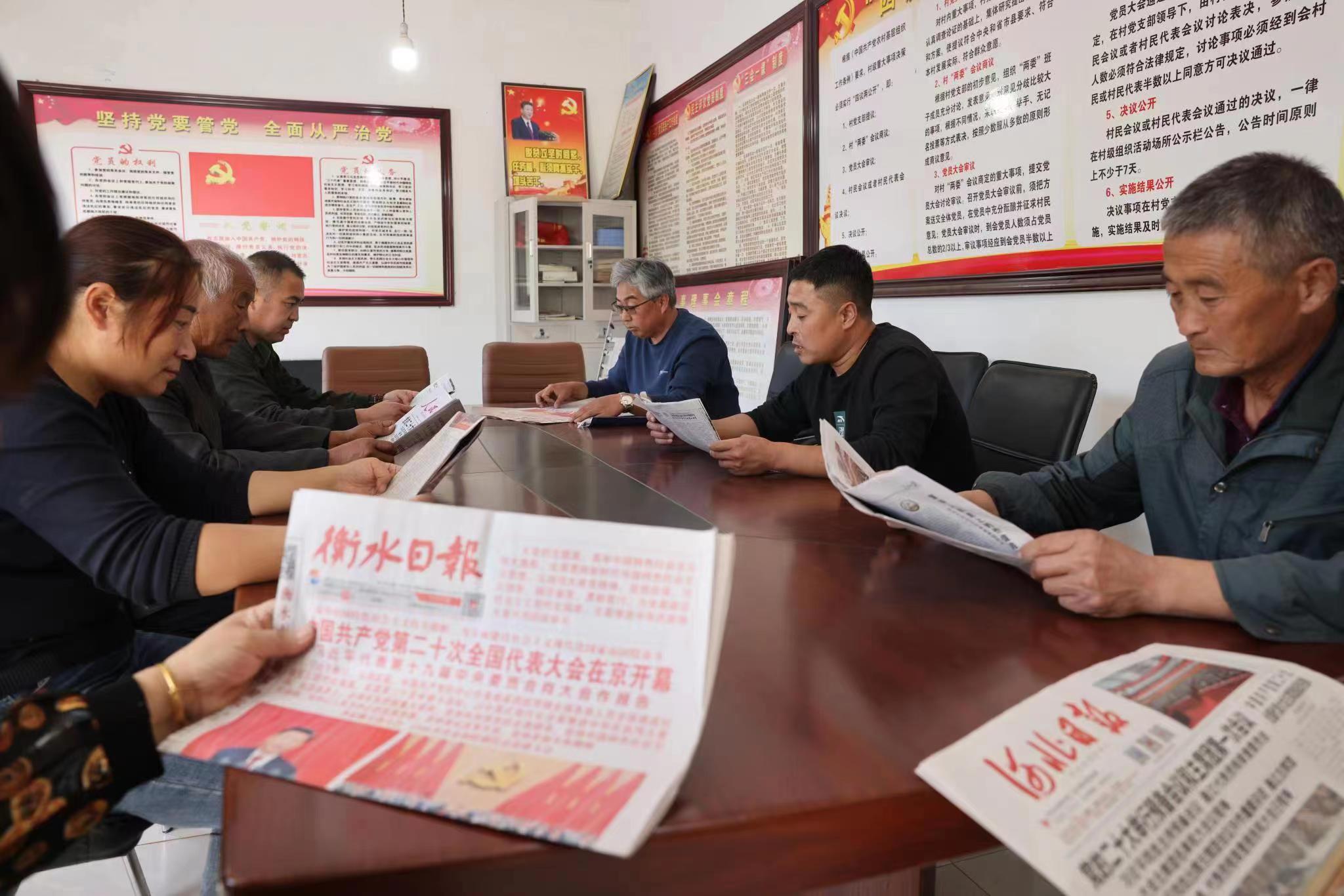 桃城区赵家圈镇前铺村党员将刊有党的二十大内容的《衡水日报》张贴到阅报栏供群众阅读。