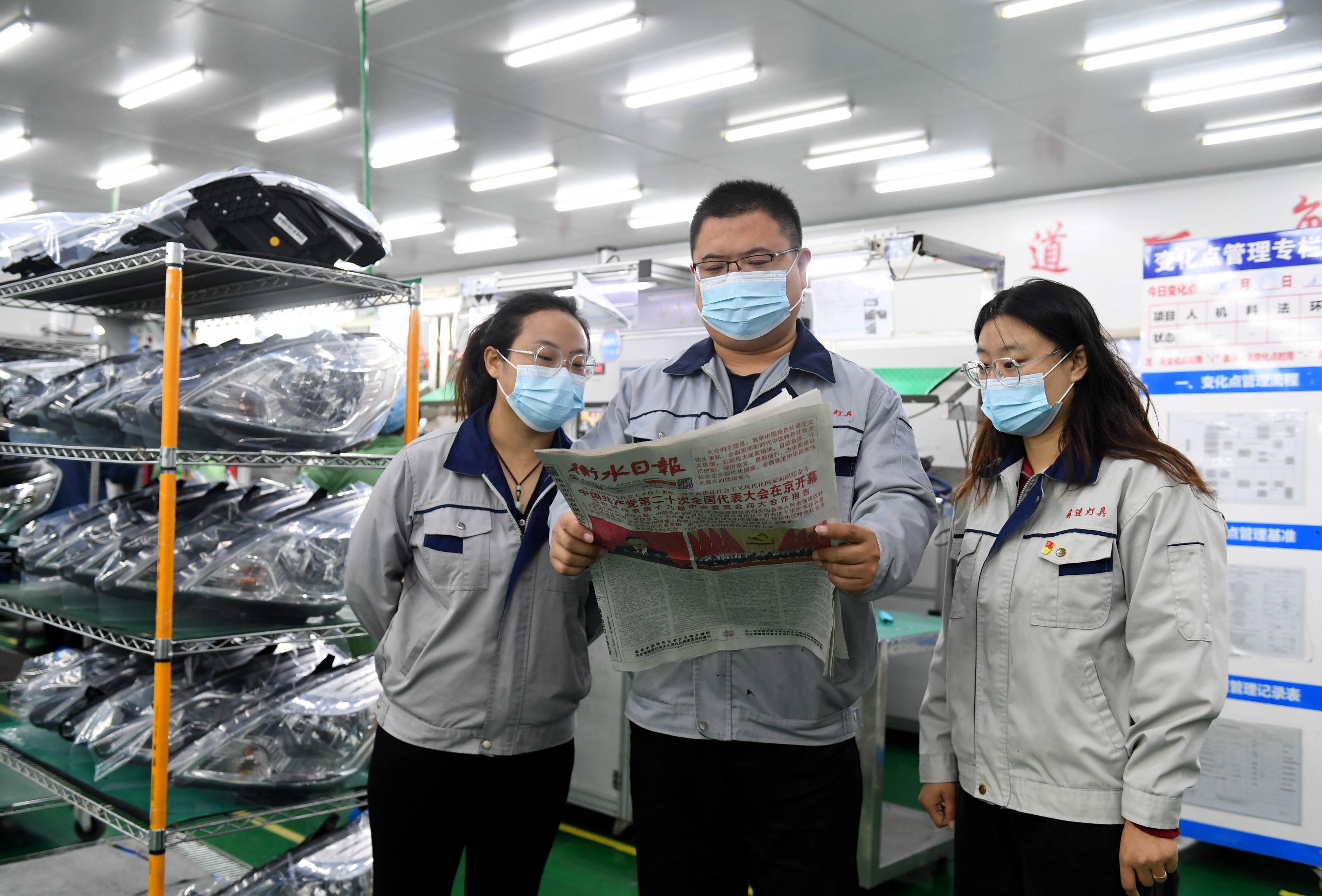 阜城县前进灯具有限公司员工学习党的二十大报告。