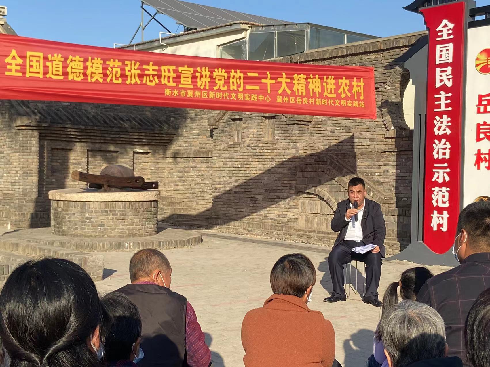 “党的二十大报告提出,要扎实推动乡村产业、人才、文化、生态、组织振兴,令我们深受鼓舞。”10月23日下午,在衡水市冀州区冀州镇岳良村新时代文明实践站里,全国道德模范张志旺向乡亲们宣讲党的二十大精神。