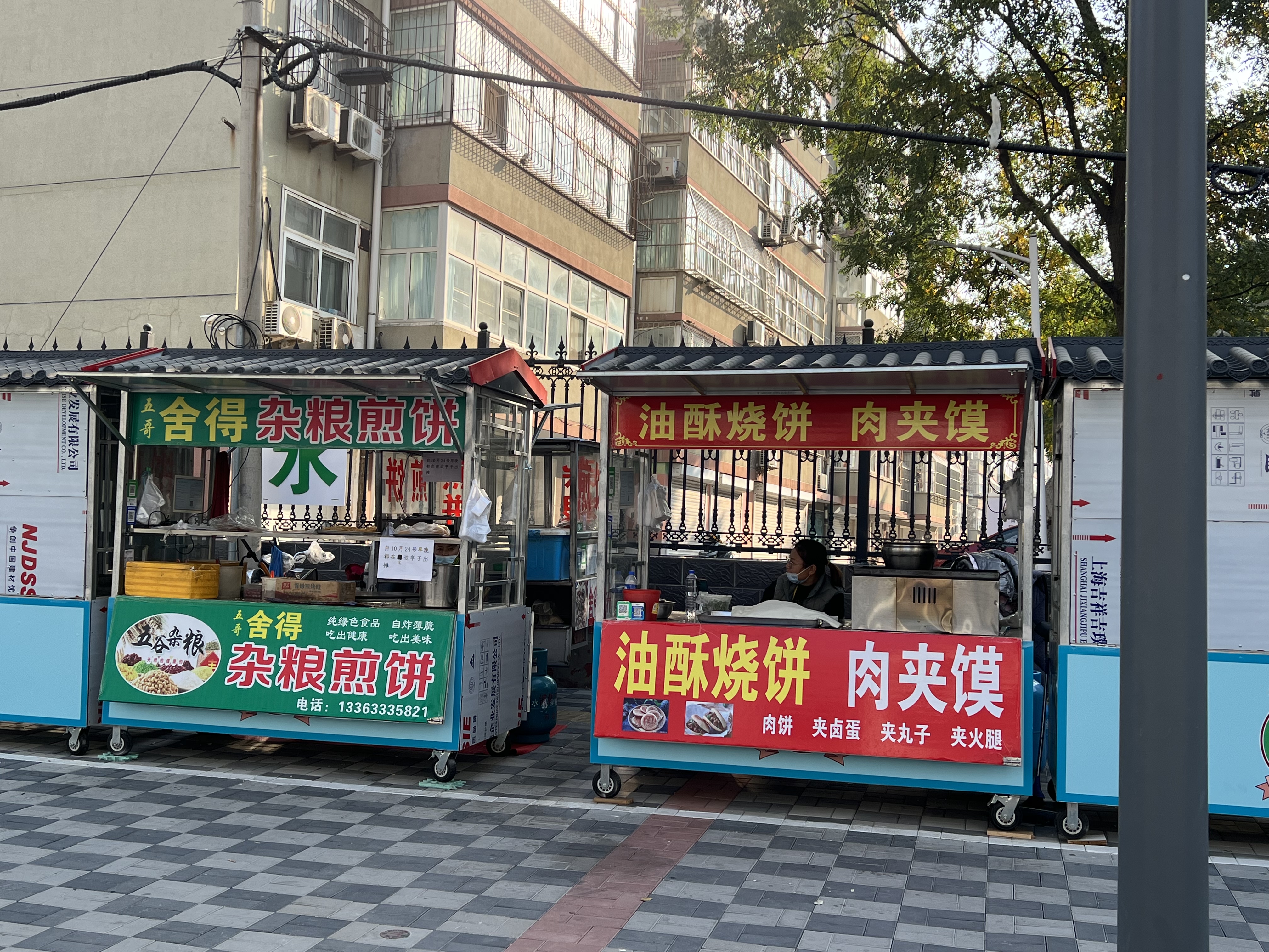 沿着康宁街往北,在新华路与康宁街交叉口东北角,同样布置的早餐车前人声鼎沸。千层肉饼、小米粥、里脊夹饼、手抓饼……早餐种类齐全,干净卫生。