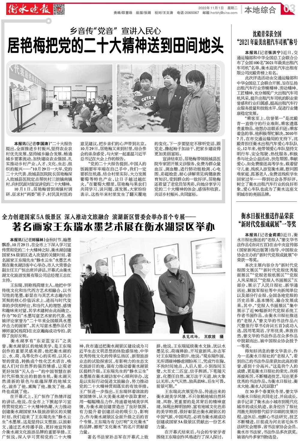 金秋时节,翰墨飘香。10月29日,在全市上下深入学习宣传贯彻党的二十大精神之际,衡水湖创建国家5A级景区进入攻坚的关键时刻,著名画家王东瑞先生“静水云生”水墨艺术展在衡水湖访客中心举办。衡水市人大常委会副主任王广恒出席并讲话。开幕式由衡水湖文化旅游发展有限公司总经理王志红主持。