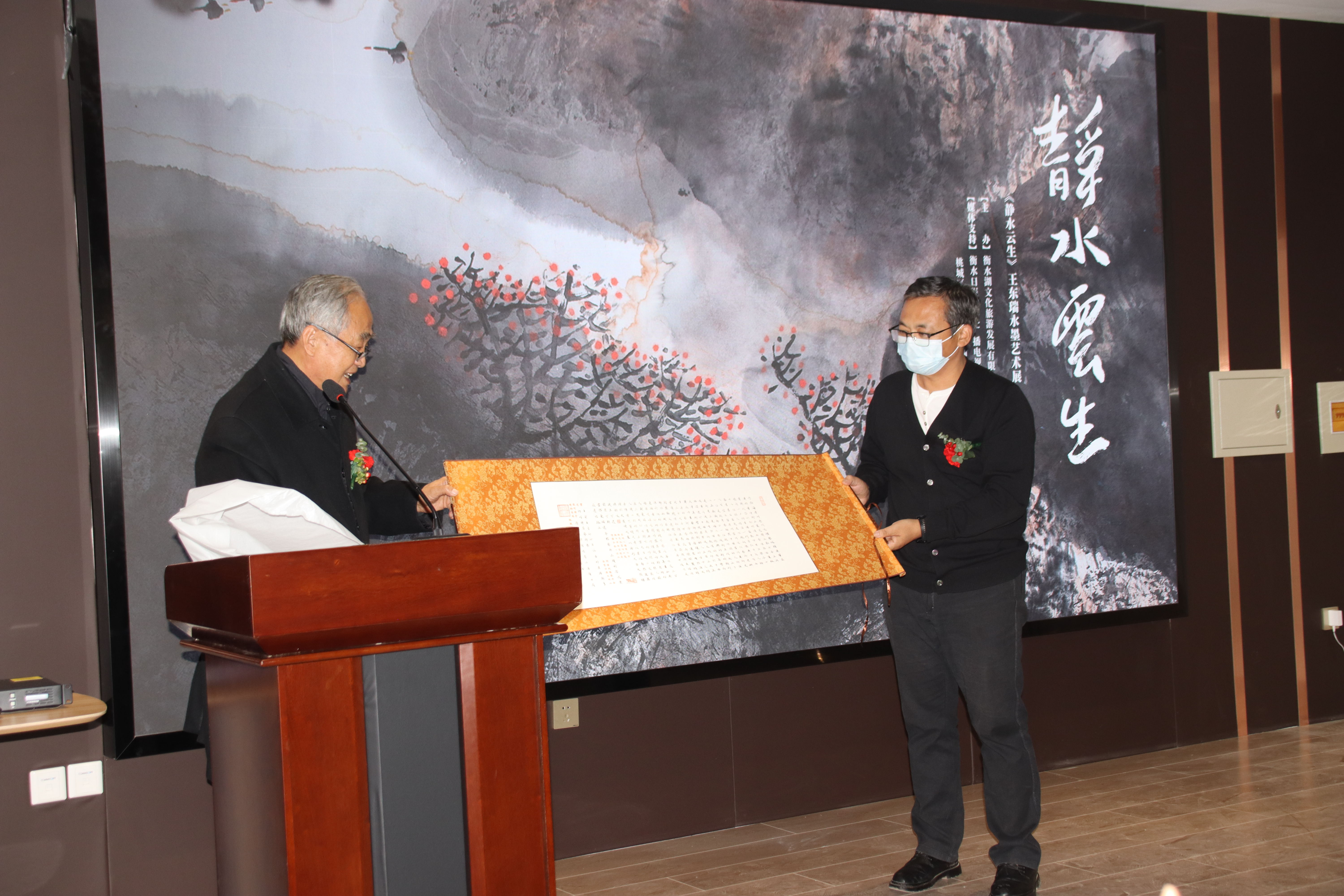 孙志军(左)致辞并赠送作品勉励王东瑞。