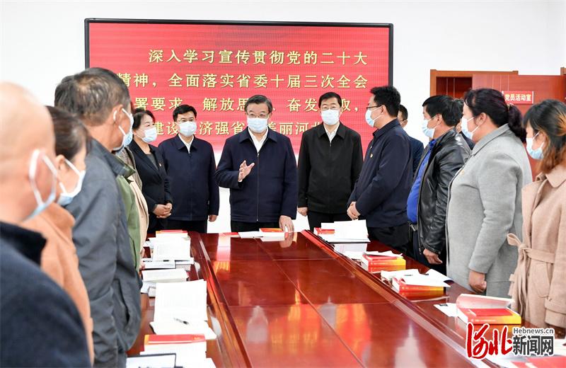 11月1日至3日,省委书记倪岳峰在承德市宣讲党的二十大精神。这是倪岳峰在隆化县七家镇西地村,详细了解基层党建情况,向党员和村民代表宣讲党的二十大精神。 河北日报记者赵海江摄