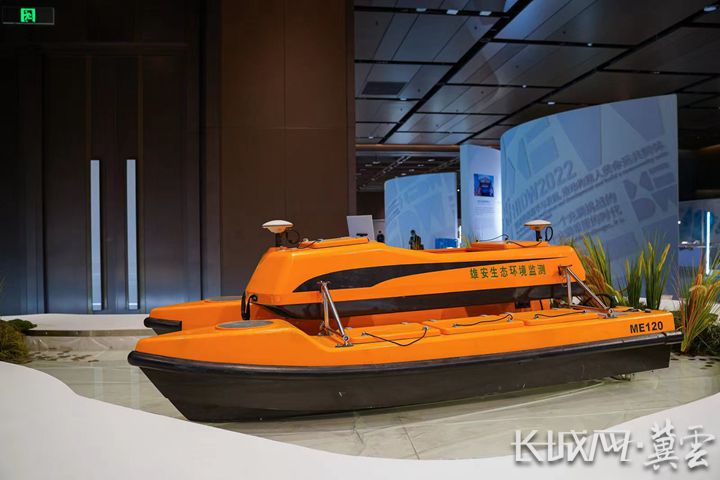 “这是日常监测白洋淀水质的生态环境监测多功能无人船,别看它小巧,却能发挥大作用。”雄安展区导览员宋金哲介绍,