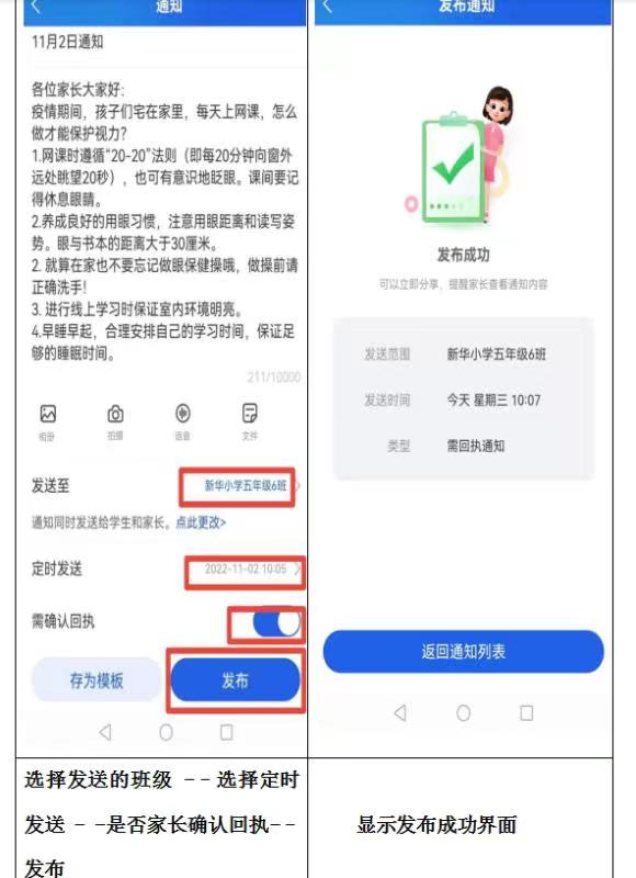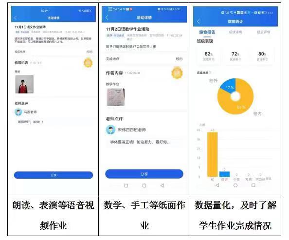 课前,教师将优质微课视频及学习任务单转发至班级群,学生预习后可将不懂的问题发到班级群,教师结合问题情况和学生的个别差异制作配套课件和问题回执单,有针对性地完成课堂教学。这不仅解决了传统教学中教师只能顾及到少数学生疑问的弊端,也提高了学生学习的主动性和积极性。课中,教师利用教室中电子交互大屏进行授课时,可以组织学生到大屏前作答、开展实践小活动或合作学习等。这种信息化互动模式,可以提高学生的学习兴趣和参与积极性,让课堂不再枯燥。课后,教师可借助平台功能清晰了解学生作业的完成情况、完成效果,并一对一对每位学生的作业进行批改和评价,批改完后还可以进行数据统计,完成率、优秀率、合格率一目了然,能够快速充分了解学生对本节课知识的掌握情况。在班级群发布相关通知和作业的同时,可以设置发送给学生家长,加强家校沟通。