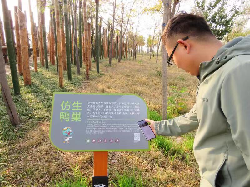 游客扫码进入自然教育解说标识系统,了解更多衡水湖自然趣闻。