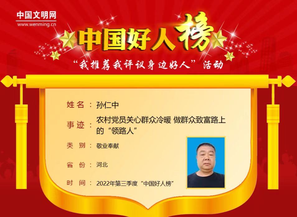 11月18日,2022年第三季度“中国好人榜”在宁夏回族自治区吴忠市现场发布,衡水市深州农村党员孙仁中上榜。
