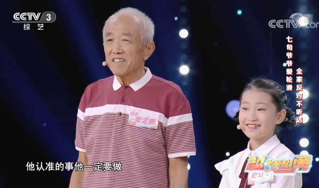11月2日晚,在央视综艺频道圆梦类节目《越战越勇》的舞台上,75岁的史之田和10岁的小孙女史立平一起组成了“轮滑祖孙”组合。他们向观众展示了俯身速滑、原地旋转、交叉炫步等花样轮滑。史之田在台上辗转腾挪,完全看不出已过古稀之年。