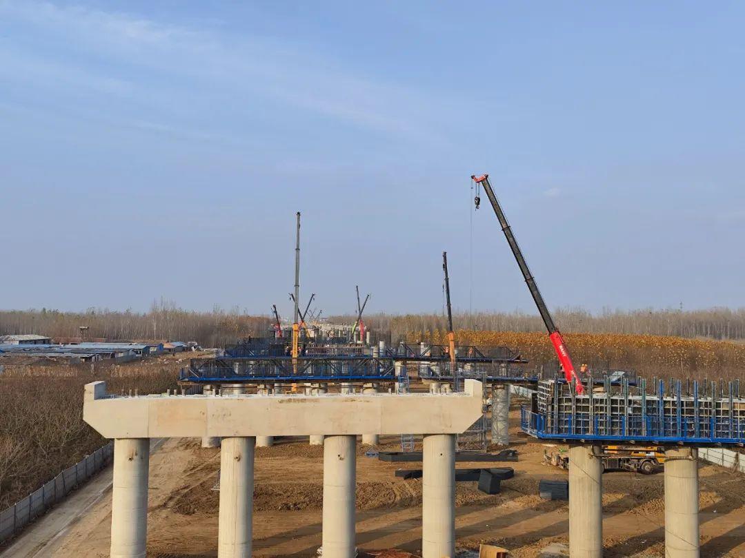 11月23日,廊坊临空经济区临空大桥施工现场,大型吊车正在进行大桥 T梁钢结构吊装。临空大桥建成后,将横跨永定河,连通南部科技创新区和北部航空物流区,成为廊坊临空经济区新地标。