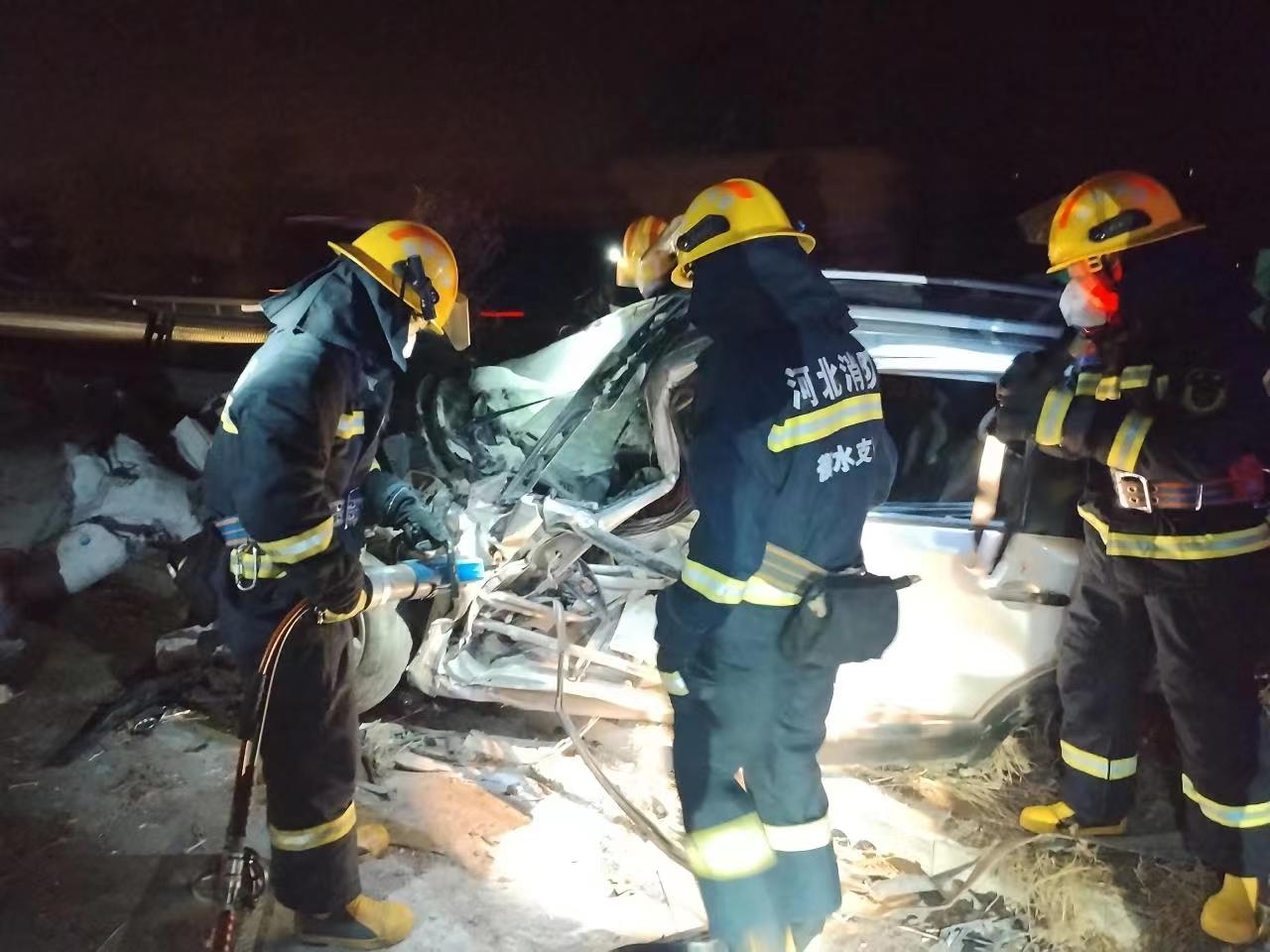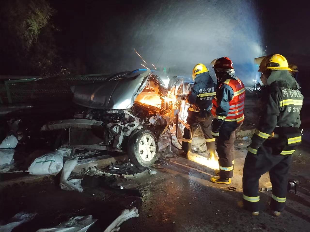 11月24日18时54分,大广高速大名方向两车相撞,一人被困,衡水市消防救援支队榕花街特勤站迅速出动两车共10人前往现场处置,经过紧张救援,最终将被困司机成功救出。