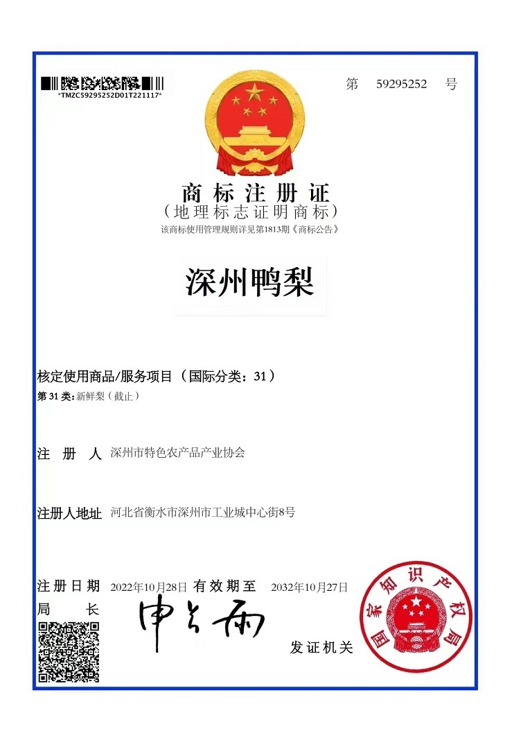 近日,国家知识产权局发布公告,衡水深州市的“深州鸭梨”通过国家知识产权局商标局核准注册,获国家地理标志证明商标。