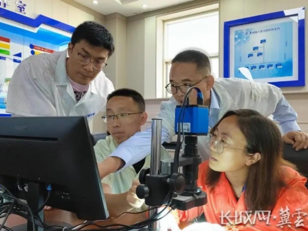 在海湾公司求真创新工作室内,郝寿尊(左二)和同事们讨论研究最近在生产中遇到的难题。长城网·冀云客户端记者 郭政 摄