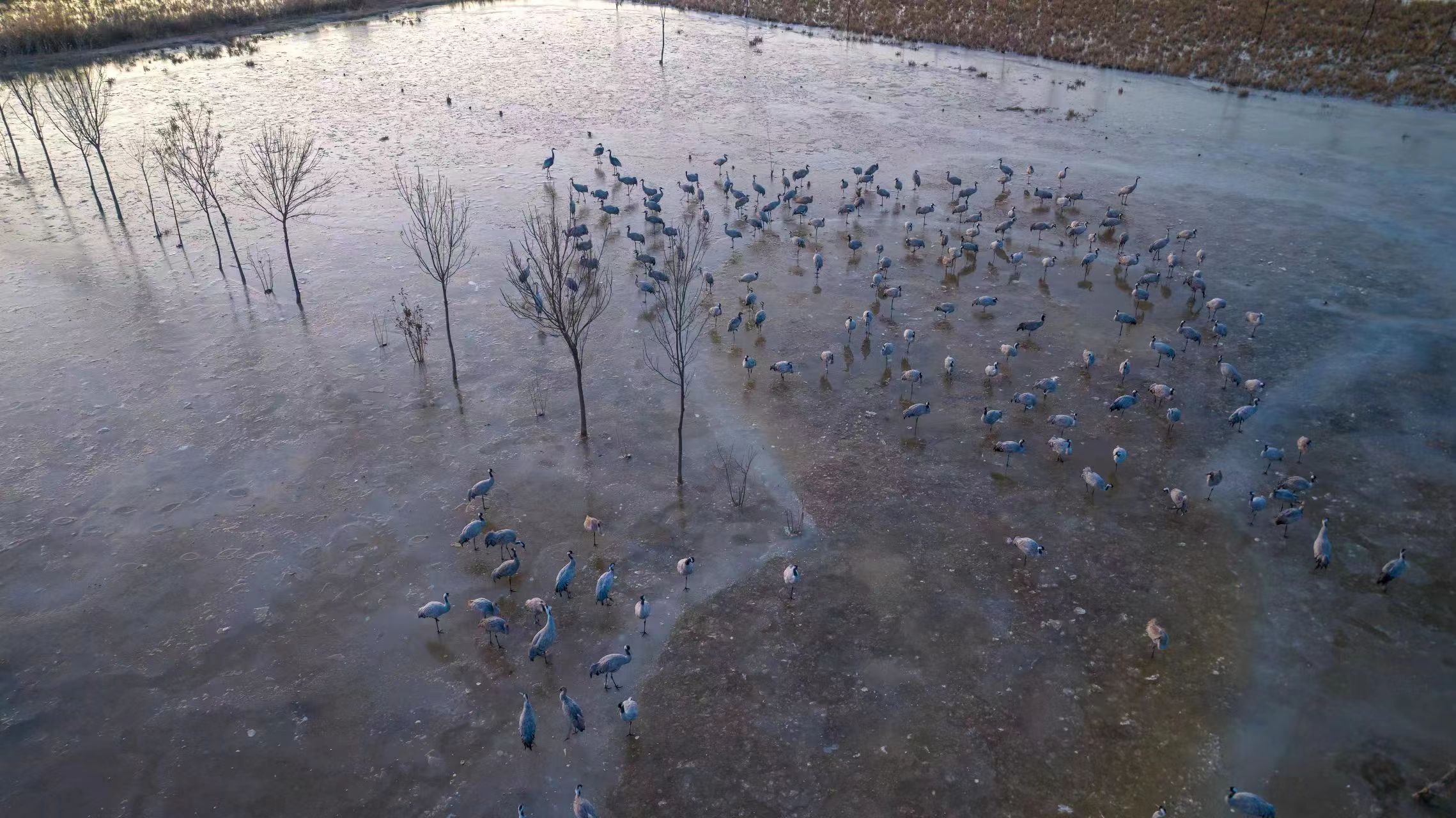 据衡水湖国家级自然保护区资源保护局监测,去年1月有近4000只灰鹤飞抵衡水湖越冬。今年灰鹤群飞抵衡水湖越冬,衡水湖国家级自然保护区资源保护局会继续对它们的迁徙不断进行监测。