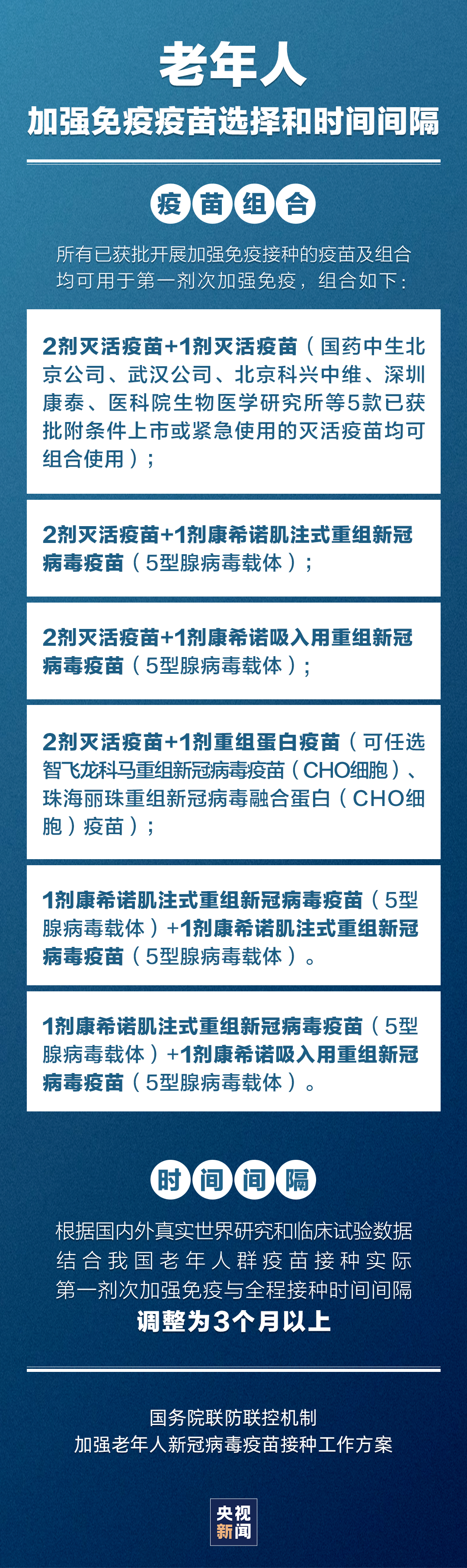 《加强老年人新冠病毒疫苗接种工作方案》明确老年人的疫苗接种和一般人群疫苗接种相比在安全、便捷、不良反应监测方面都要有专门的措施。特别是在加强针接种上,详细列出了不同技术路线的疫苗组合推荐。