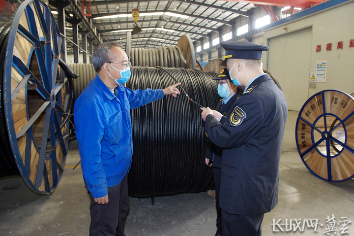 河北邢台电缆有限责任公司首席质量官(左一)为邢台市市场监督管理局的工作人员介绍产品质量。通讯员 陈克家 供图