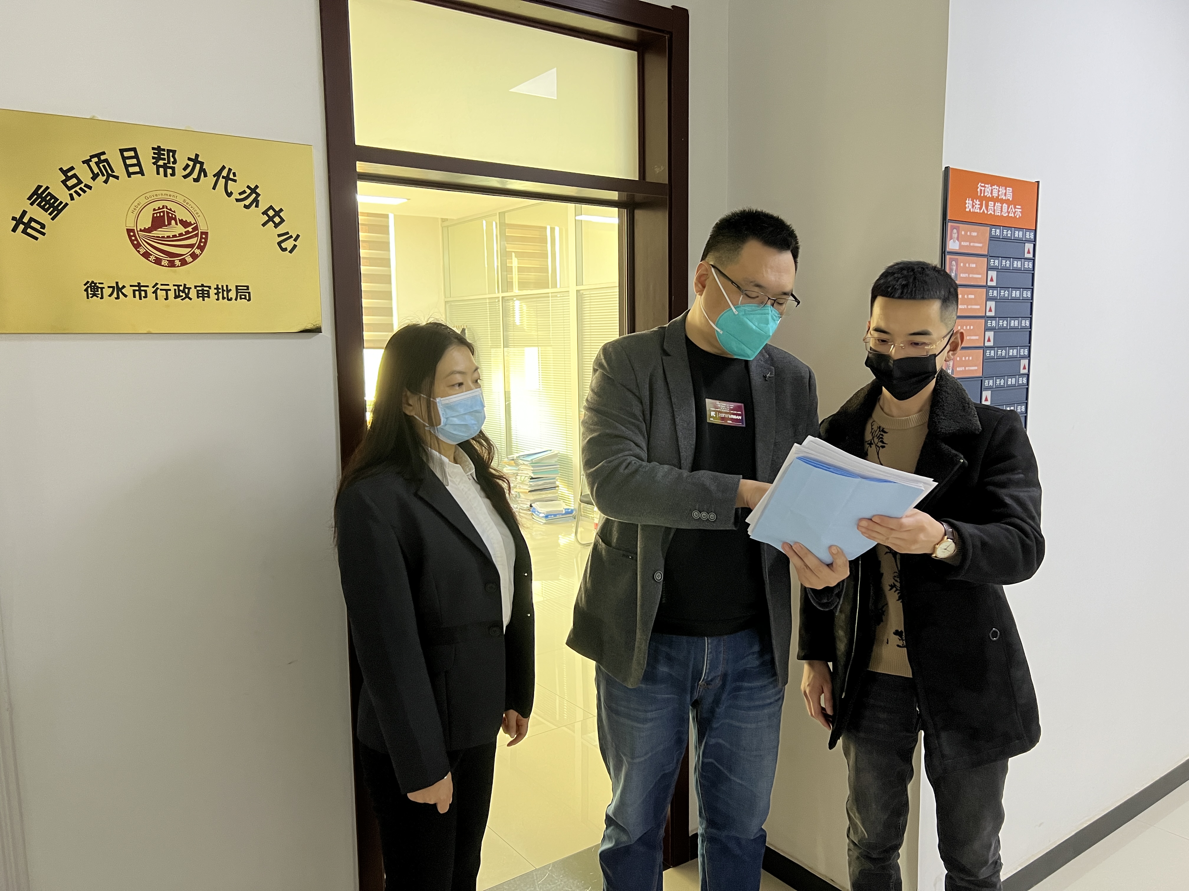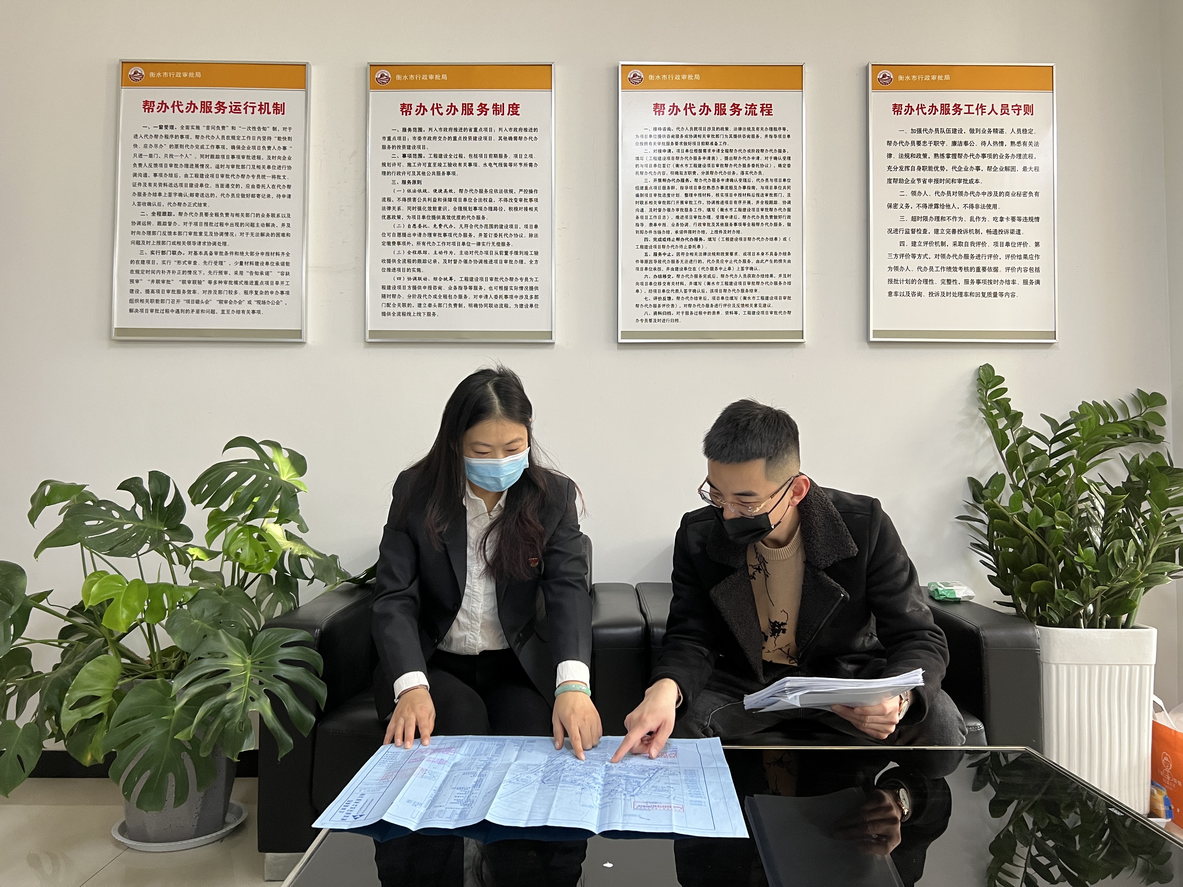 衡水市市民中心二楼市重点项目帮办代办窗口,代办员刁伟玺一边翻阅企业资料,一边与城业房地产公司锦绣前城·付园项目部工作人员贾亚迪沟通交流,详细讲解施工许可证办理政策,耐心解答咨询。