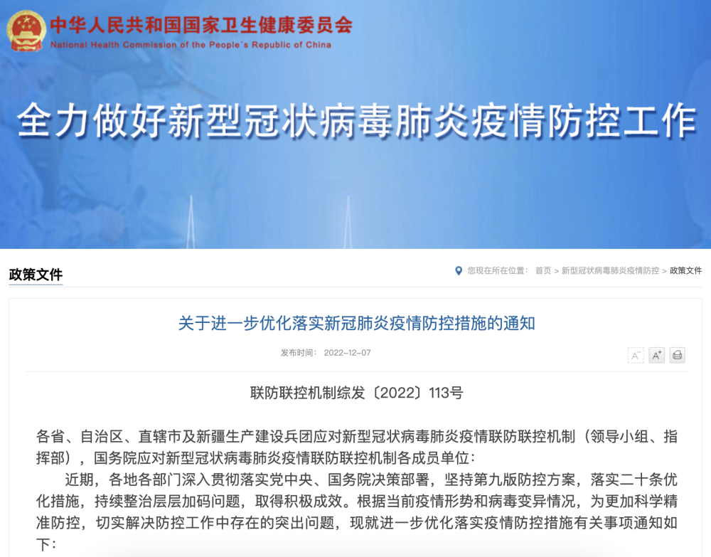 近期,各地各部门深入贯彻落实党中央、国务院决策部署,坚持第九版防控方案,落实二十条优化措施,持续整治层层加码问题,取得积极成效。根据当前疫情形势和病毒变异情况,为更加科学精准防控,切实解决防控工作中存在的突出问题,现就进一步优化落实疫情防控措施有关事项通知如下: