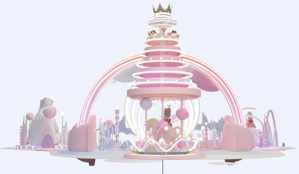 “白夜童话”在外广场营造的是一座绮幻城堡,星河梦之树,璃光璀璨小星球们演绎了一场炫彩灯光秀,“火烈鸟”着灯光闪亮登场;“猫将军”叮叮当当的眺望着辽阔苍穹;七月兔在水晶球里做着梦期待着初雪,一篇璀璨的画卷缓缓展开,跟着小动物和小女孩们一起奔赴奇幻梦境。