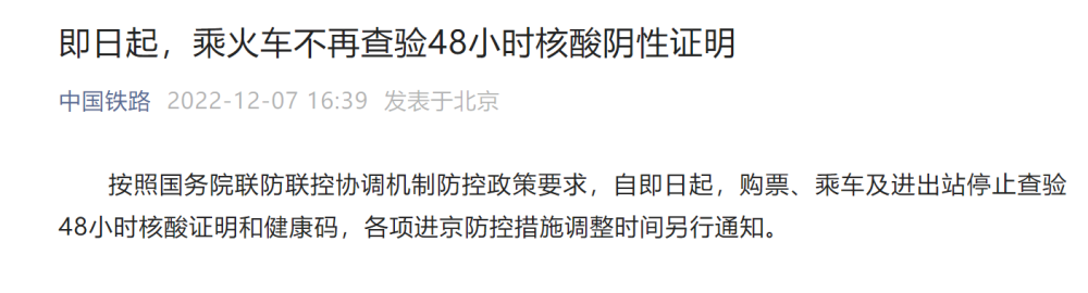 按照国务院联防联控协调机制防控政策要求,自即日起,购票、乘车及进出站停止查验48小时核酸证明和健康码,各项进京防控措施调整时间另行通知。微信公众号截图 来源:新华社 点赞 +1 微博 微信 我要评论 发布 相关推荐 最近火出圈的化橘红 可是化痰妙药 我爱我家 11小时前 有备无患 这几样东西你车上有吗 我爱我家 11小时前 共享智造“县”在时丨降本 30%、提效 50%!张家口怀来“共享车间”太给力 关注 12小时前 春运期间 衡水73.6万余人次乘坐火车出行 衡水速览 3天前 河北唐山鸡毛掸子火出圈 七旬农村大娘成“网红” 关注 3天前 长图|防患未“燃”!春季野外防火安全课,一起学习 关注 3天前 “深圳将禁行电动自行车”不实(2026·03·11) 专题新闻 6天前 有些东西不能带上火车 人在旅途 6天前 春节快递停运、春运绿皮车严重超员……别被这些谣言骗了! 专题新闻 03-10 热门 一天 三天 一周 1 老场景唤醒温暖记忆 冀州老街开启常态化运营 2 借智取经赋能产业数字化转型 衡水10家重点龙头企业赴临沂考察学习 3 衡水华润燃气:燃气安全进社区 精准宣传护民生 4 今年衡水将完成营造林14.2万亩 5 【新闻发布】 衡水发布“双走双帮”专项行动方案 千万元资金直击特色产业集群痛点 6 【“十五五”开局看衡水】科技赋能产业旺 品质过硬销路好 ——武强县北大洼现代农业示范区见闻 7 打破国外垄断 河北省首个众筹科研项目在安平通过验收 8 衡水市商务局系列“组合拳”全链条赋能企业“出海”拓市场 9 武邑张英华:悉心照料因病卧床公公18年 10 【新闻发布】锚定“五最”目标 衡水市发布优化营商环境“新蓝图” 1 衡水湖畔:山桃花盛放 吸引市民踏春赏景 2 践行社会主义核心价值观|市文广旅局开展"竹编风铃挂饰”爱国主题实践活动 3 热血青年赴征程 不负韶华卫家国 衡水桃城区举行2026年上半年新兵入伍欢送仪式 4 衡水推出不动产“带封过户”改革 5 衡水:2026年度中小学教育机器人创客竞赛开赛 6 全国两会中的“衡水声音”获央媒省媒持续关注 7 衡水八极拳传人李晓阳:以拳砺初心 以身传武魂 8 春风启新程 银龄绽芳华 ——衡水老年大学2026年春季新学期开学啦 9 家门口来了北京专家! 衡水五院牵手首都医科大学三博脑科医院共建医联体 10 2026年“金融3·15”特别报道|中国工商银行衡水分行:写好“五篇大文章”金融活水润民生 1 守护安全 畅通消费 衡水市2026年“3·15国际消费者权益日”系列活动启动 2 人勤春来早 春管正当时——衡水市扎实推进春季农业生产纪实 3 衡水全力加强麦田春管夯实夏粮丰收基础 4 气温回暖年货干果易霉变 衡水市人民医院消化内科医生提醒:出现这三种情况切勿食用 5 【新闻发布】每人每月最高800元 衡水向中度以上失能老年人发放养老服务消费补贴 6 一方小田园 “种”出新生活——衡水滨湖新区开心农场春管见闻 7 【新闻发布】衡水发布2025年消费维权“成绩单”——12315热线受理投诉按时办结率100% 8 衡水市工商业联合会(总商会)第七次代表大会召开 9 衡水市将于4月初开展残疾人运动员选拔工作 10 河北衡水:湖城春景入画来 广告 广告 广告 24小时 1 衡水市气象局开展气象科普进校园活动 2 阜城青年:告慰先烈 矢志从军 3 【衡视频】北京医疗团队走进衡水五院 4 “十五五”时期怎么干?新华社播发重磅政论! 5 一线探“智”|“共享设备”让设备利用率提升至90% 6 奋进的河北·数读新变化丨⑪“共享智造”发力 产业集群焕新 7 河北:春风行动联动京津 多点发力稳就业促疏解 8 净化网络餐饮安全环境 衡水市569家餐饮外卖被下线 9 衡水市商务局系列“组合拳”全链条赋能企业“出海”拓市场 10 无人机空中“巡诊” 电力人地头“把脉” 武邑县供电公司倾力服务护航春耕春灌