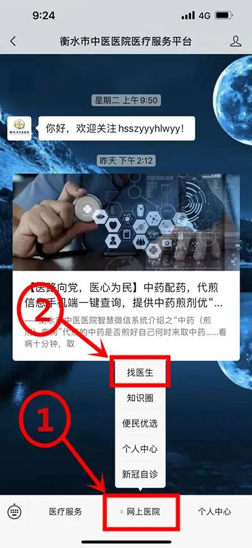 1、长按或扫描二维码进入“衡水市中医医院医疗服务平台”