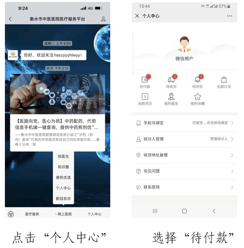 进入“平台”,依次点击:“网上医院--个人中心--待付款”,微信或支付宝支付。