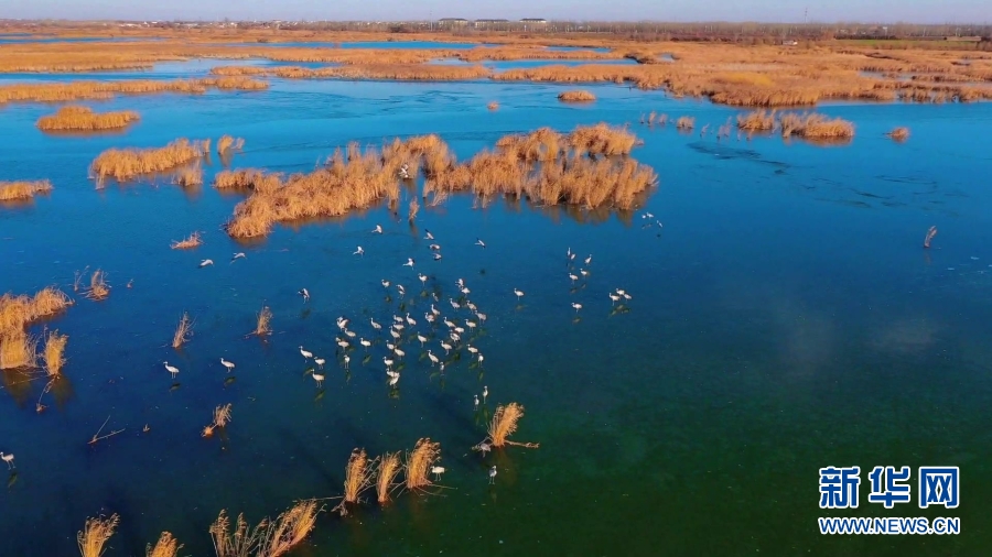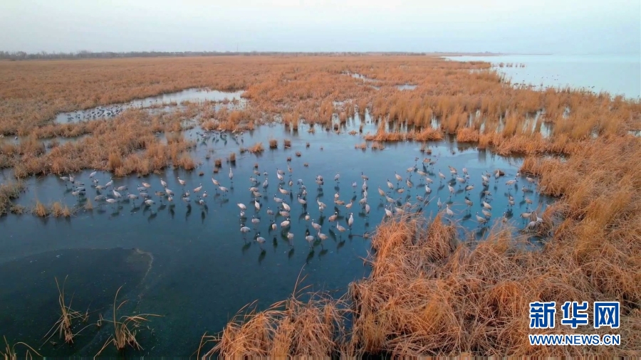 蓝宝石般的湖面、金黄的芦苇丛,灰鹤群徜徉其间。新华网发 王铁良 摄