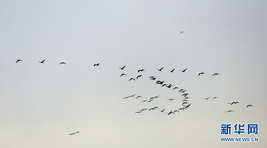 成群灰鹤在低空盘旋起舞,“舞姿”各异。新华网发 陈康 摄