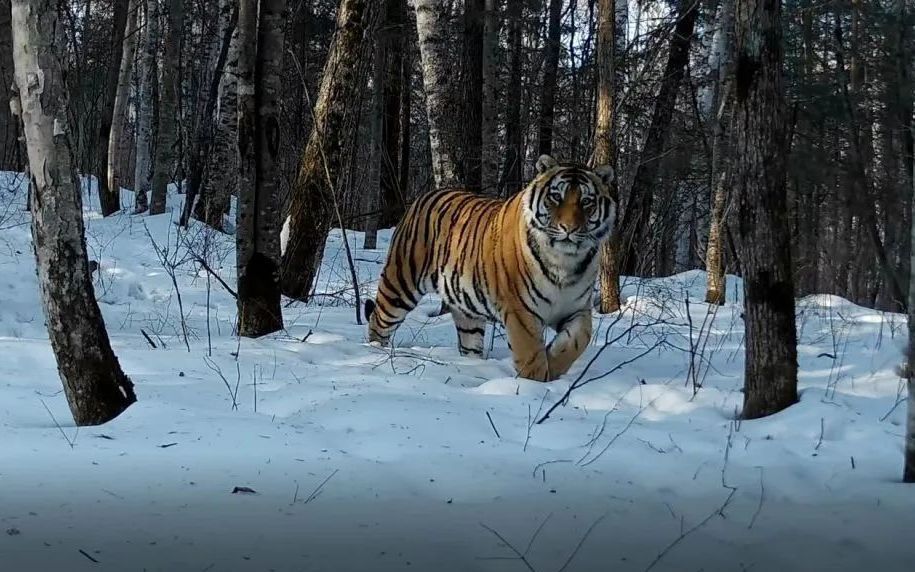 近日,吉林省天桥岭林业局动物保护工作人员在整理红外相机资料时,发现12月15日在新开林场辖区内拍摄到了一只野生东北虎,视频中这只野生东北虎威风凛凛,在森林中散步。