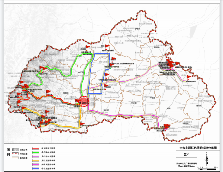 据介绍,我市红色历史文化资源丰富,红色资源整体呈现类别全面、分布广泛、主线清晰的特点。资源类别囊括了旧址故居、红色村落、碑墓陵园、历史展馆、 红色教育基地、新时代建设成就等多个类别。今年8月—10月,市文化广电和旅游局与市文商旅研究中心一起进行了邢台市红色革命资源的梳理工作。经过资料搜集、现场考察、资源梳理、信息对比,共统计梳理出邢台市红色资源 133 项,提炼归纳了六大红色精神谱系:艰苦奋斗的抗大精神、奋发作为的愚公精神、团结群众的人山精神、不屈不挠的太行精神、无私奉献的劳模精神、自强不息的奋斗精神,并以这六大红色精神谱系为主题,塑造出邢台六大主题红色路线。