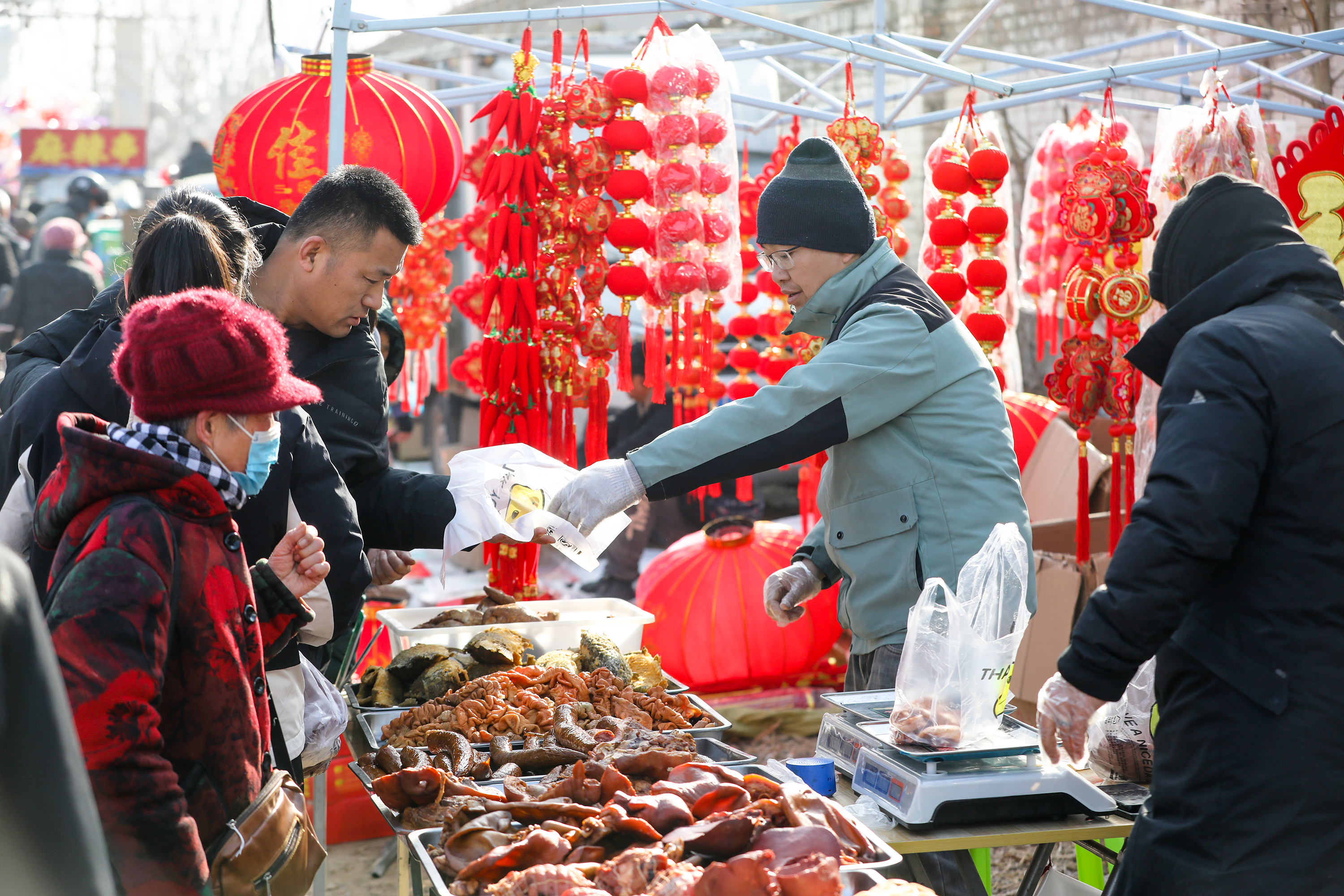 除了附近的村民,还有不少从市区过来赶集的市民。对于很多市民来说,赶大集不仅是为了购置年货,更是来感受那浓浓的年味。早几天,市民李女士就在日历上标注好赵圈镇大集的日子,早上没吃早饭就带着孩子过来了。“我们在大集的早餐摊上吃了豆腐脑和油条,然后开始置办年货。孩子是第一次来赶大集,这不兴奋得不得了。”李女士被孩子拉着跑向前面的摊位。只见孩子蹲在摊位前,欣喜地看着一幅幅花样繁多的“福”字、春联和灯笼等各式装饰物,摸一摸这个,拿一拿那个,哪个都舍不得放下。