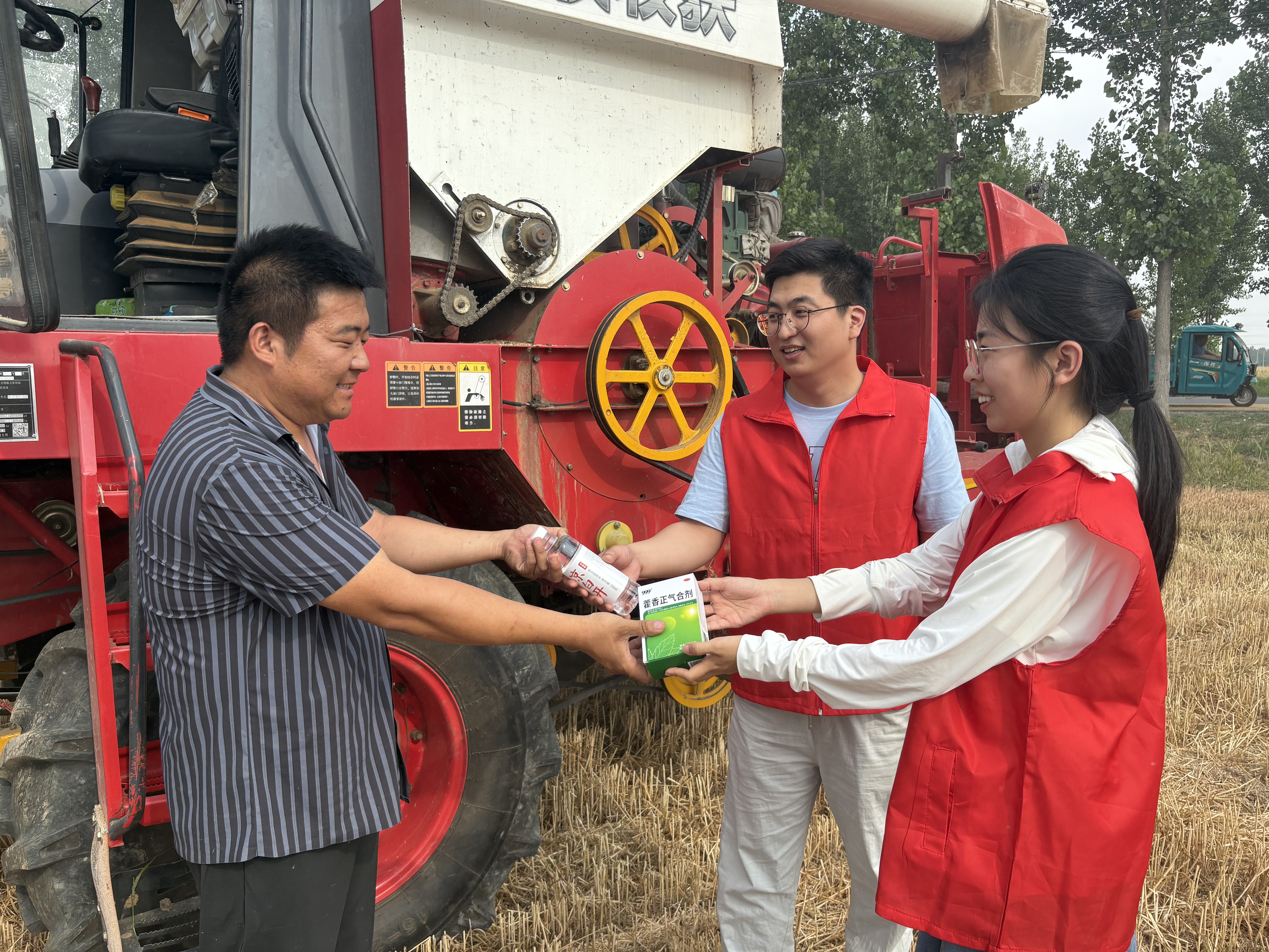 志愿者为收麦人员提供防暑药品,预防中暑。阜城县融媒体中心供图