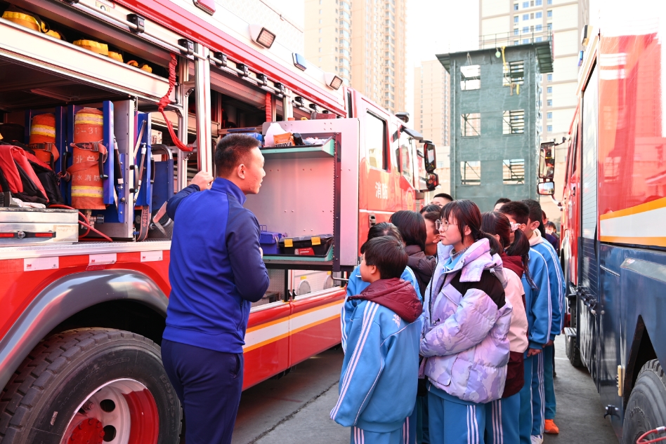 消防救援人员介绍消防设施器材。啜瑞琪 摄