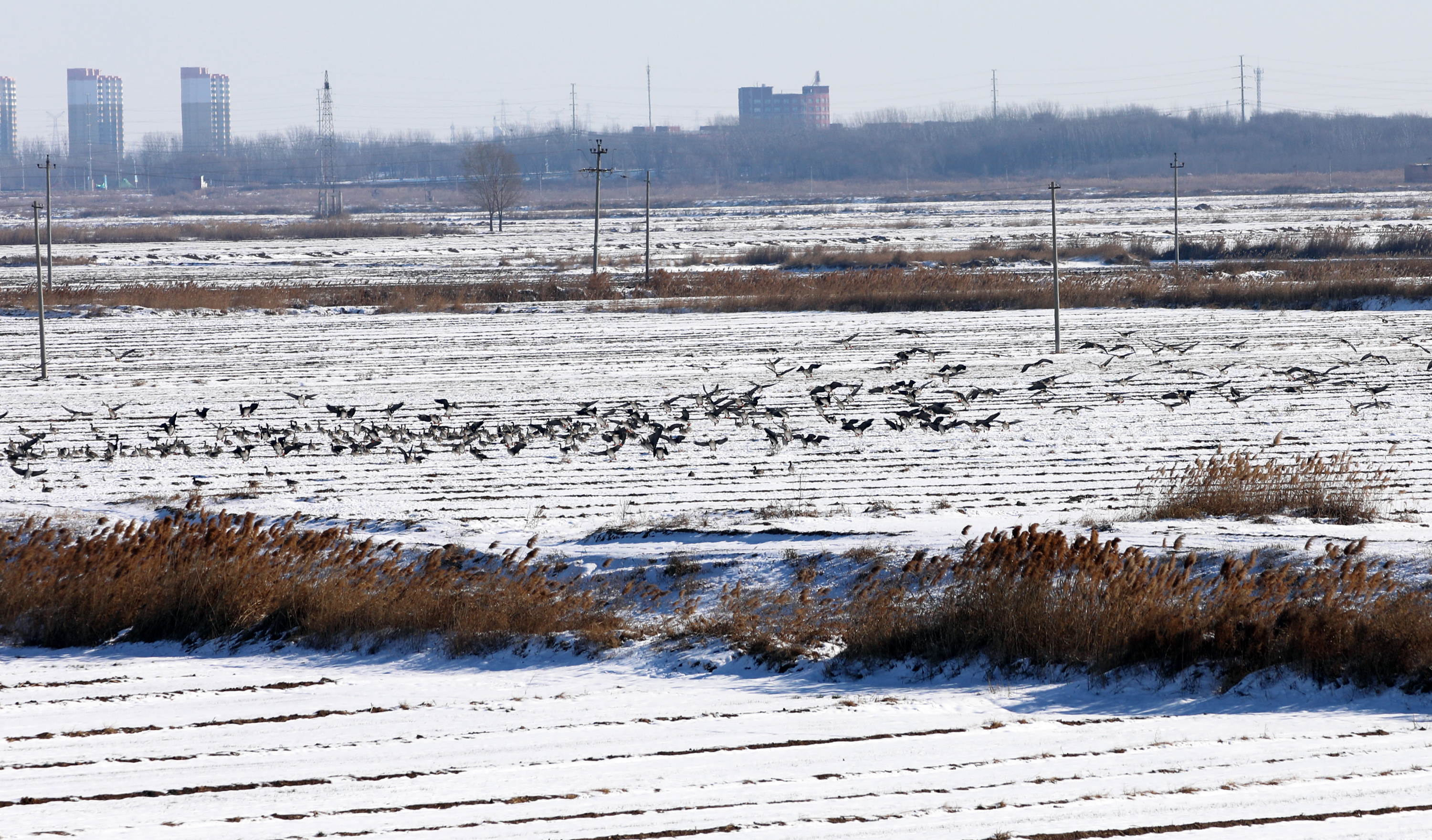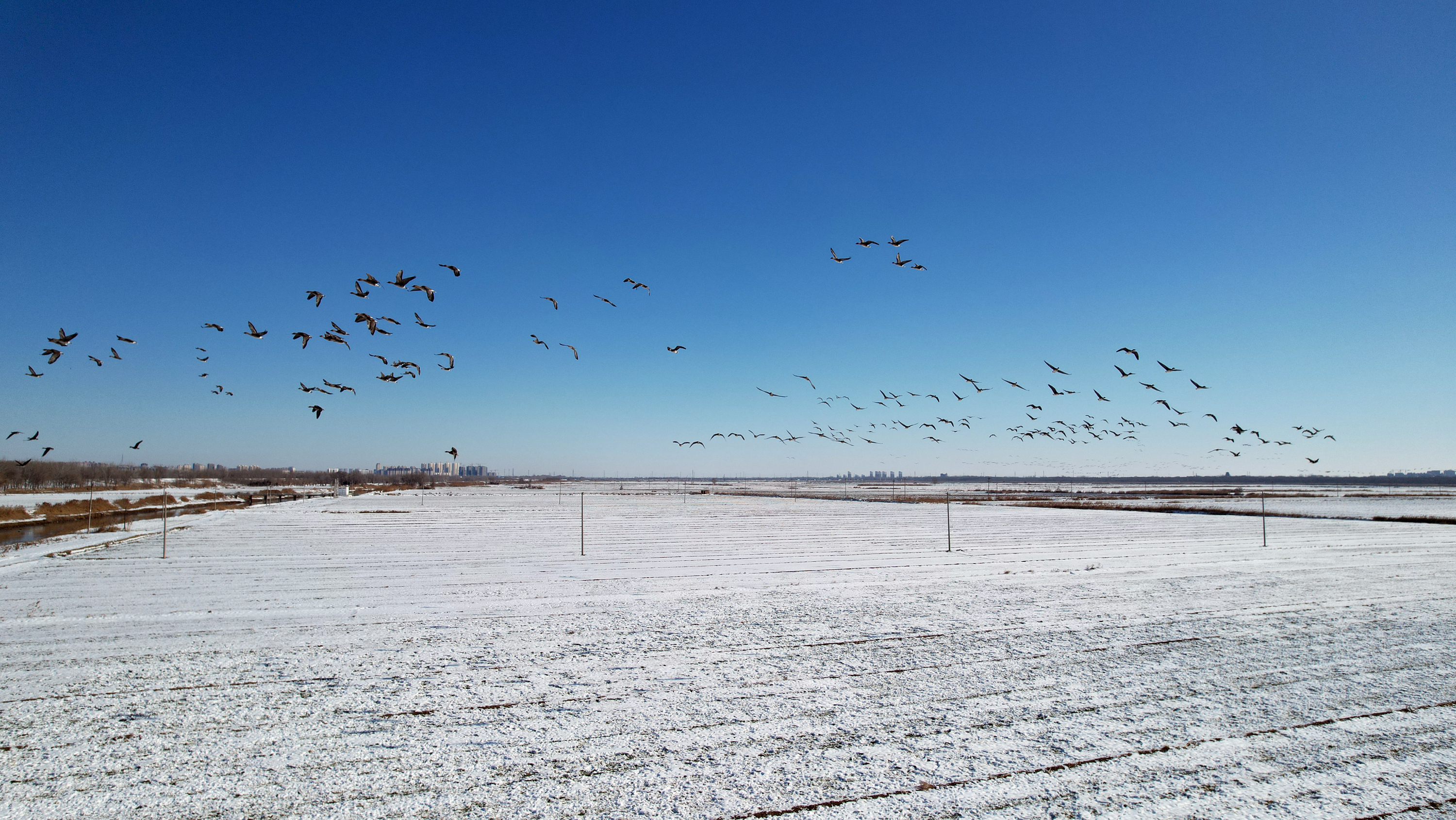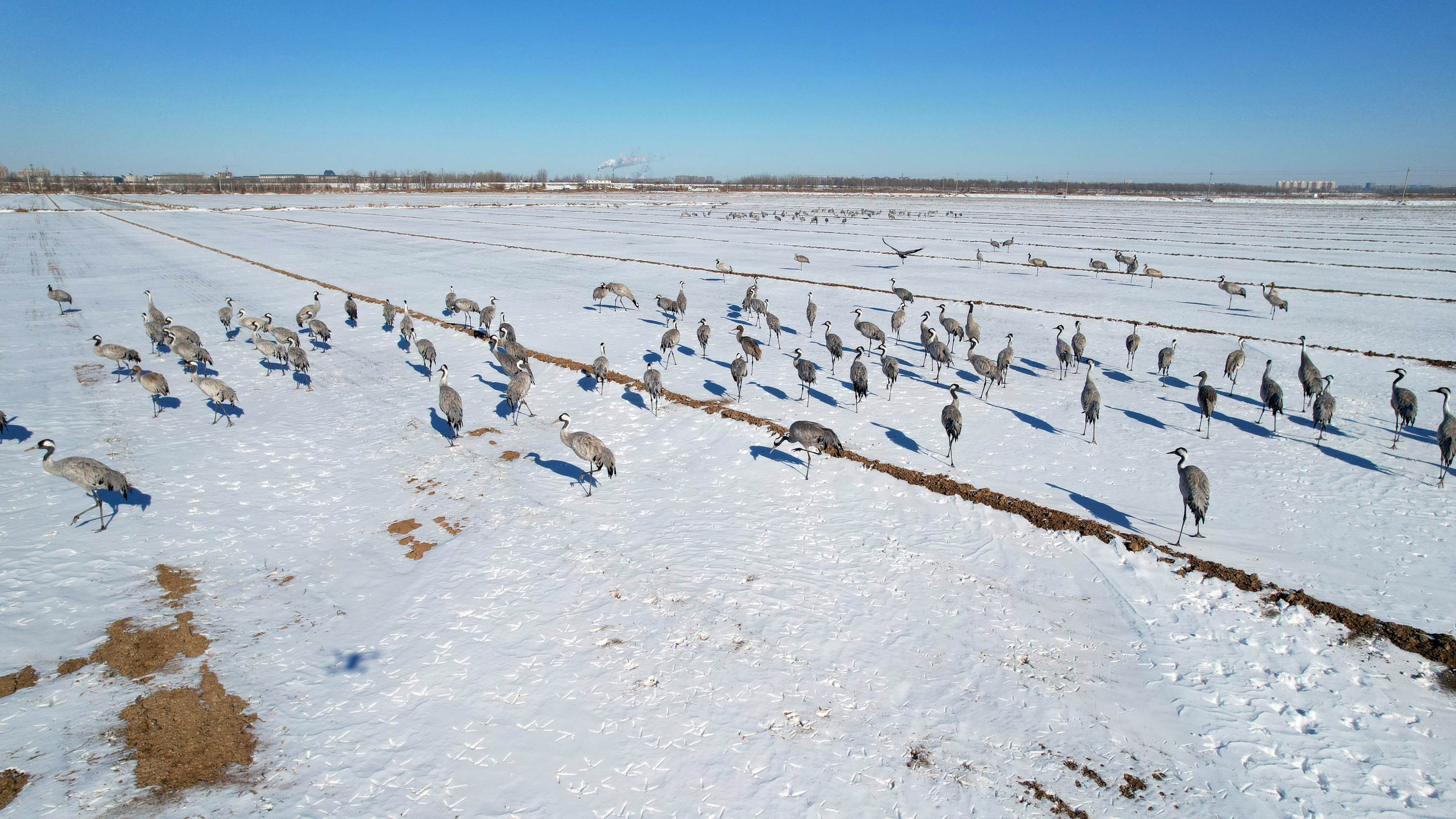 随后,记者来到衡水湖畔的滏阳新河浅滩上看到,广袤的土地覆盖着皑皑的白雪,令人心旷神怡。成群结队的灰鹤、大雁停留在农田里,鹤群时而昂首挺胸、翩跹起舞,时而伫立凝望、亭亭玉立,时而扇动双翅、凌空飞翔;雁群或悠然漫步,或嬉戏追逐,或休闲觅食,一派生机勃勃的迷人景象,在广袤农田里形成了一道靓丽的风景线。