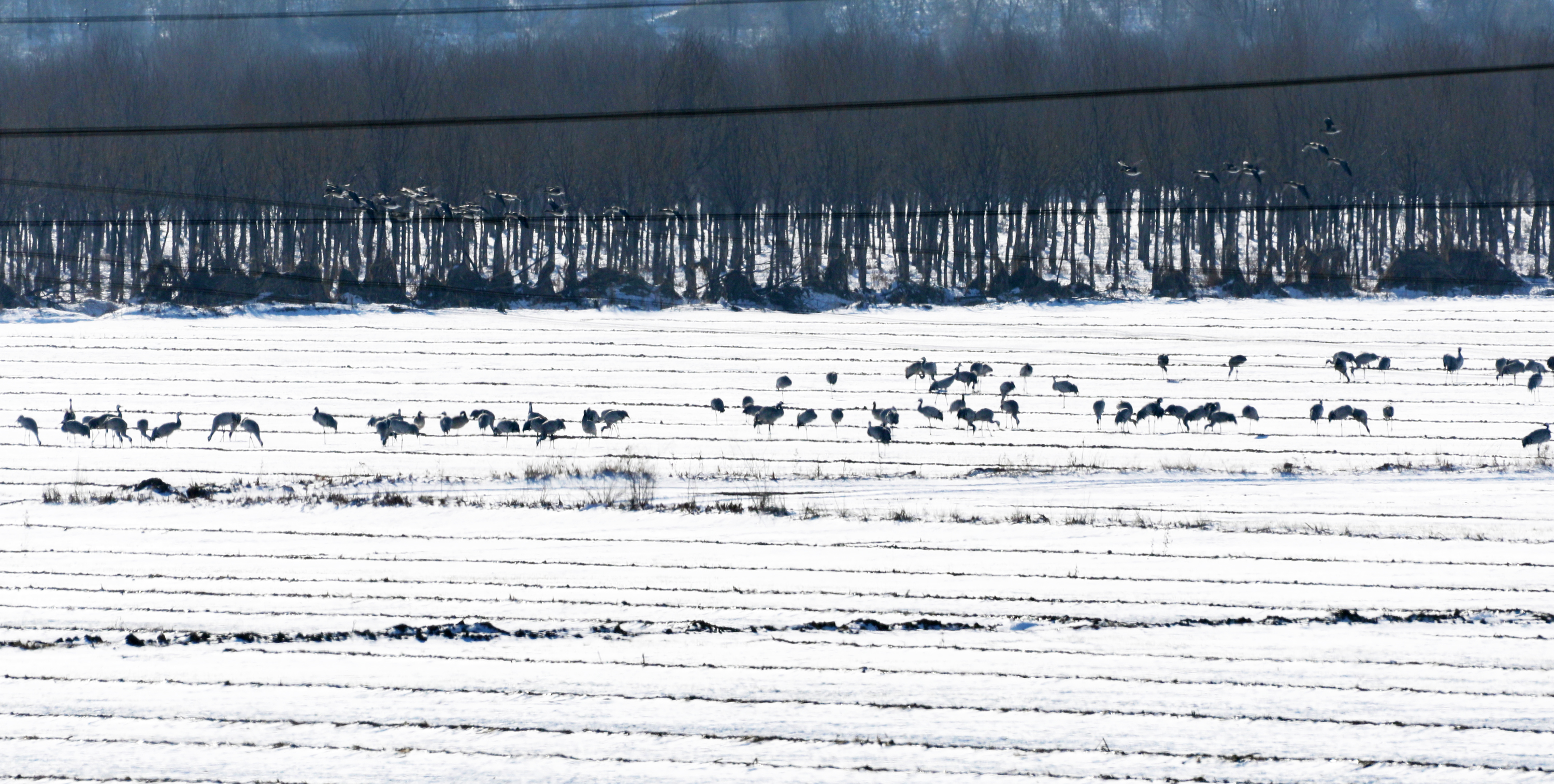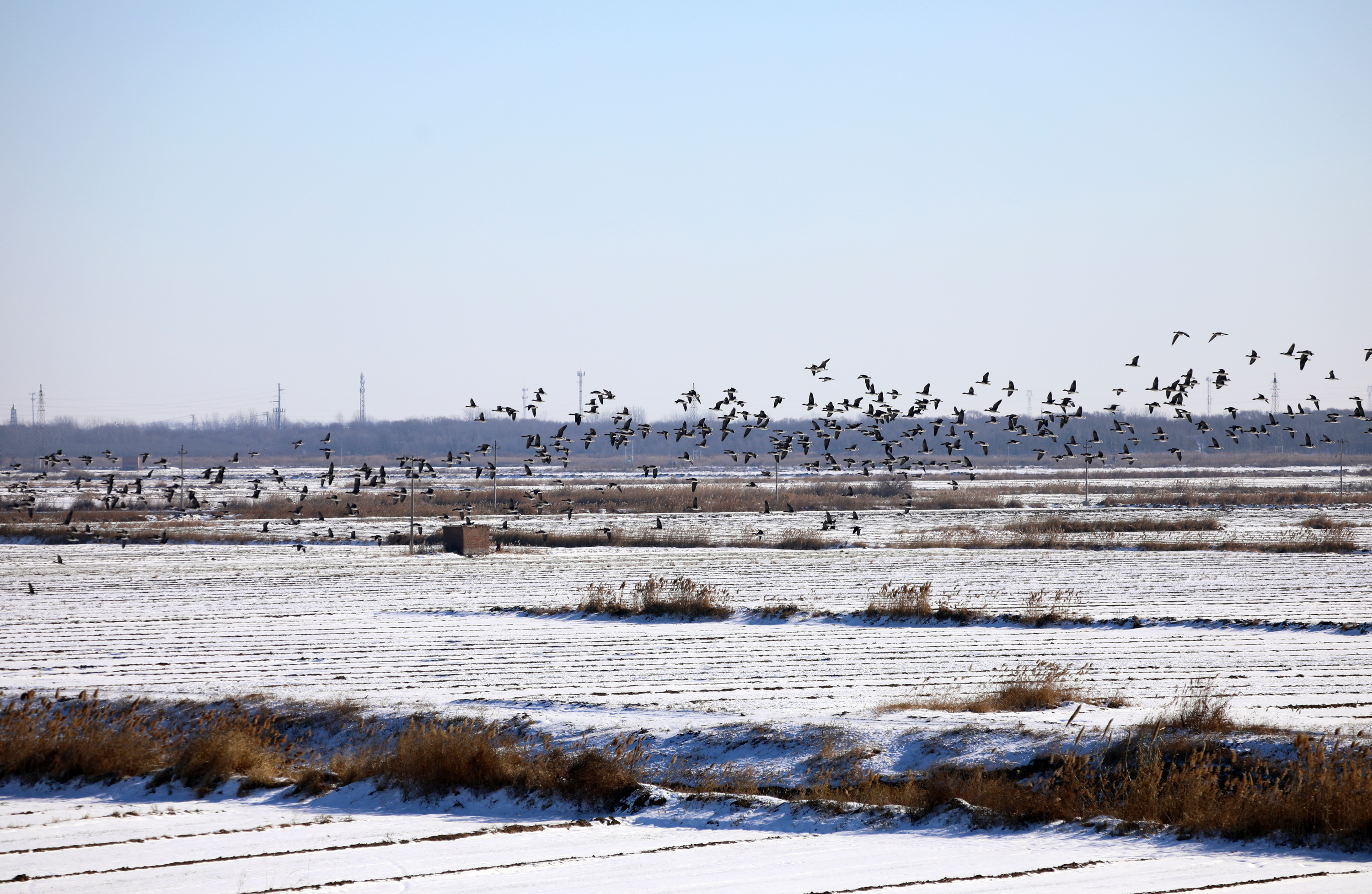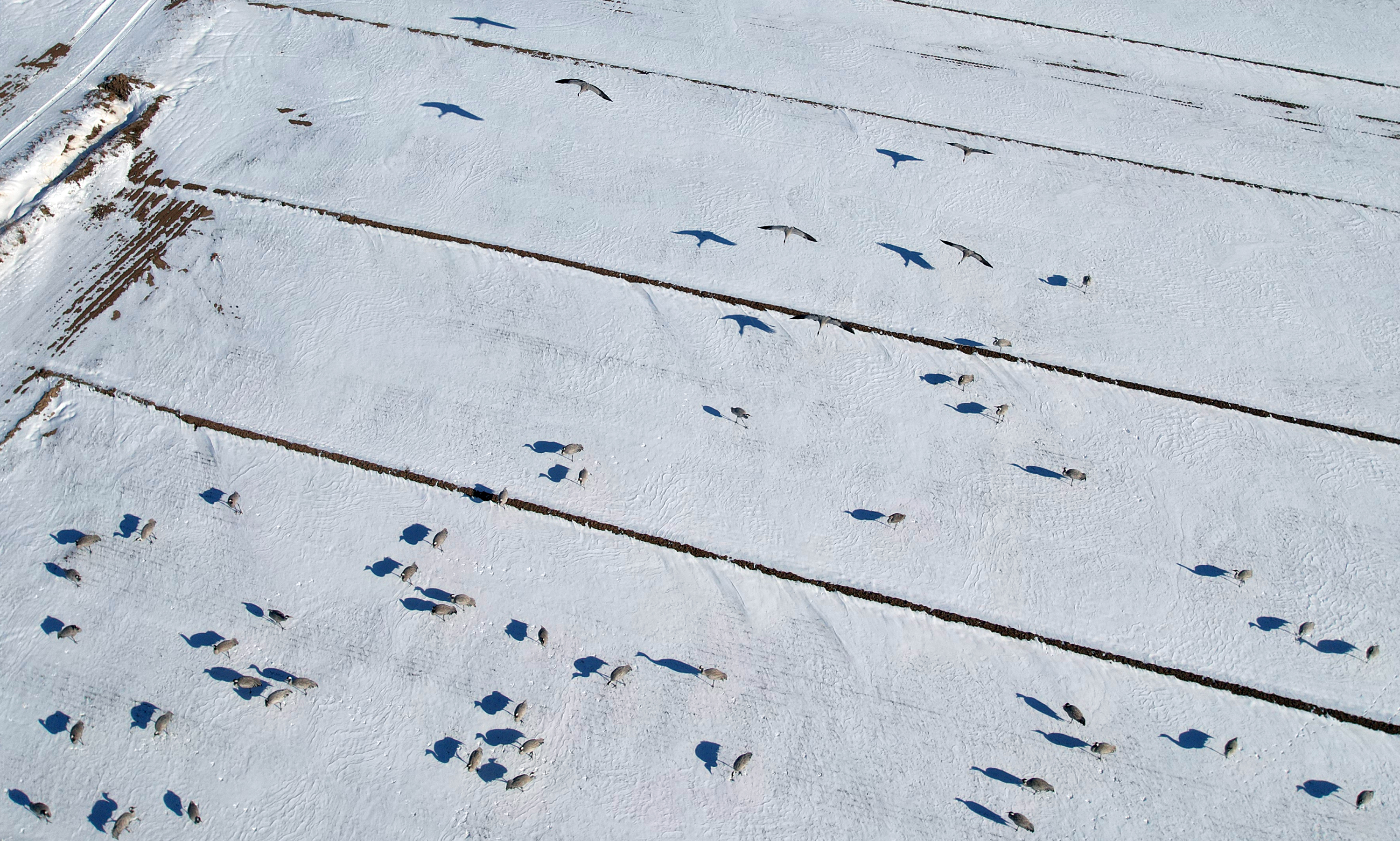 随后,记者来到衡水湖畔的滏阳新河浅滩上看到,广袤的土地覆盖着皑皑的白雪,令人心旷神怡。成群结队的灰鹤、大雁停留在农田里,鹤群时而昂首挺胸、翩跹起舞,时而伫立凝望、亭亭玉立,时而扇动双翅、凌空飞翔;雁群或悠然漫步,或嬉戏追逐,或休闲觅食,一派生机勃勃的迷人景象,在广袤农田里形成了一道靓丽的风景线。