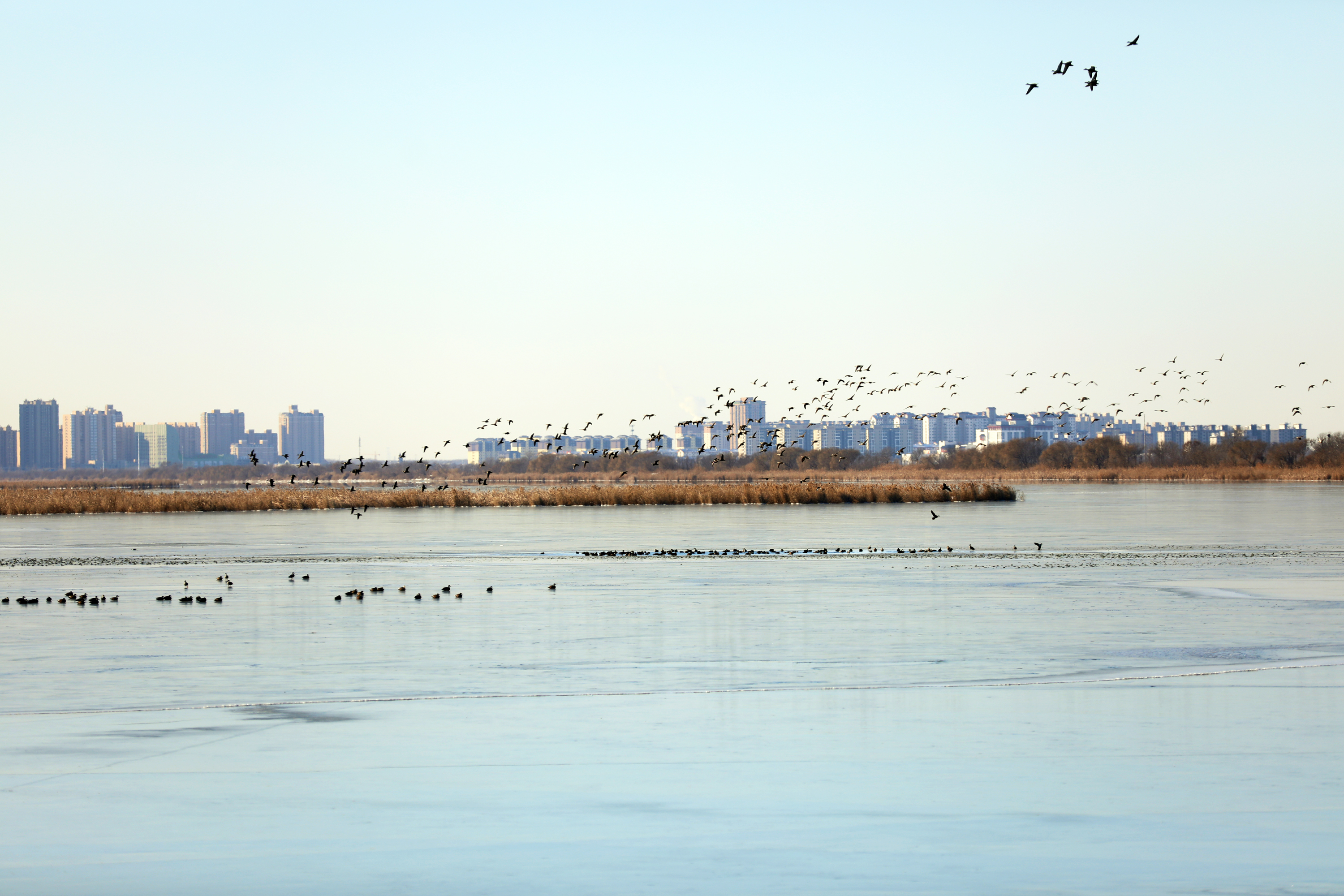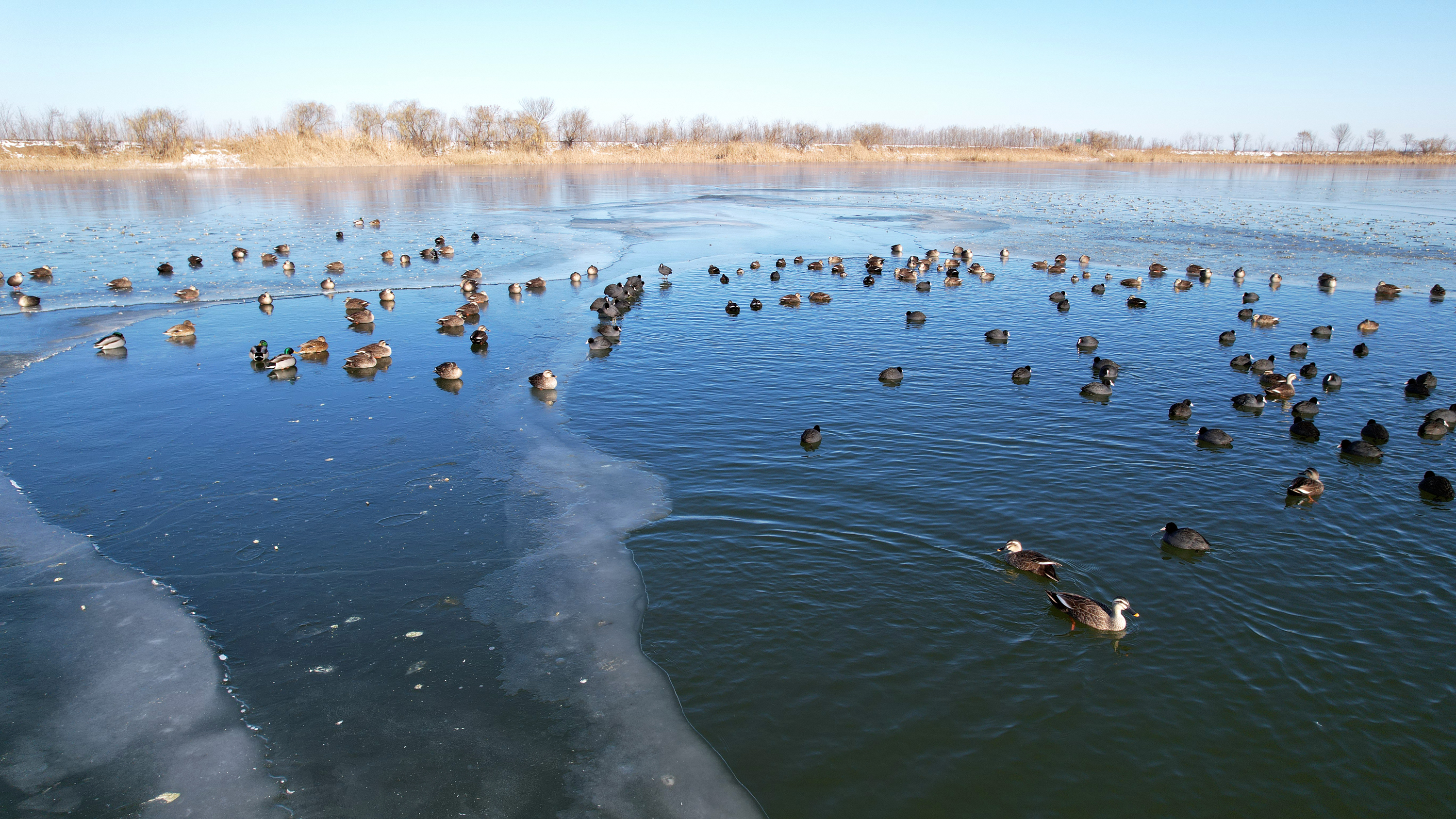 上午9时许,记者一行来到小湖隔堤处,碧波荡漾的衡水湖已结冰,湖面上的冰花像天然的刺绣,矗立的碎冰犹如破碎的琉璃,与欢畅热闹的鸟儿们相映成趣,野鸭组合或冰面跺步,或戏水游弋,或自由翱翔,为冬日里静谧的衡水湖带来无限生机和活力。