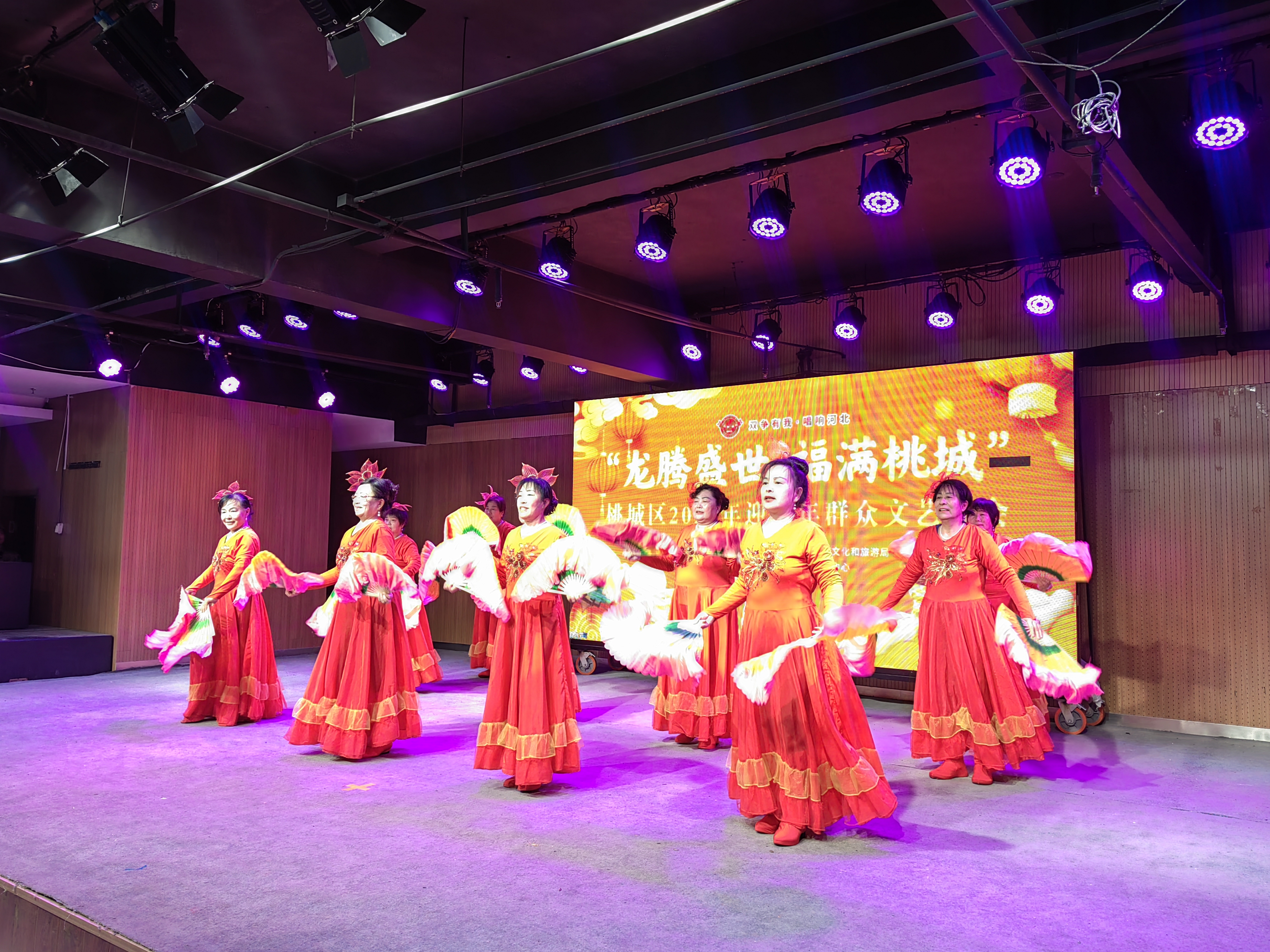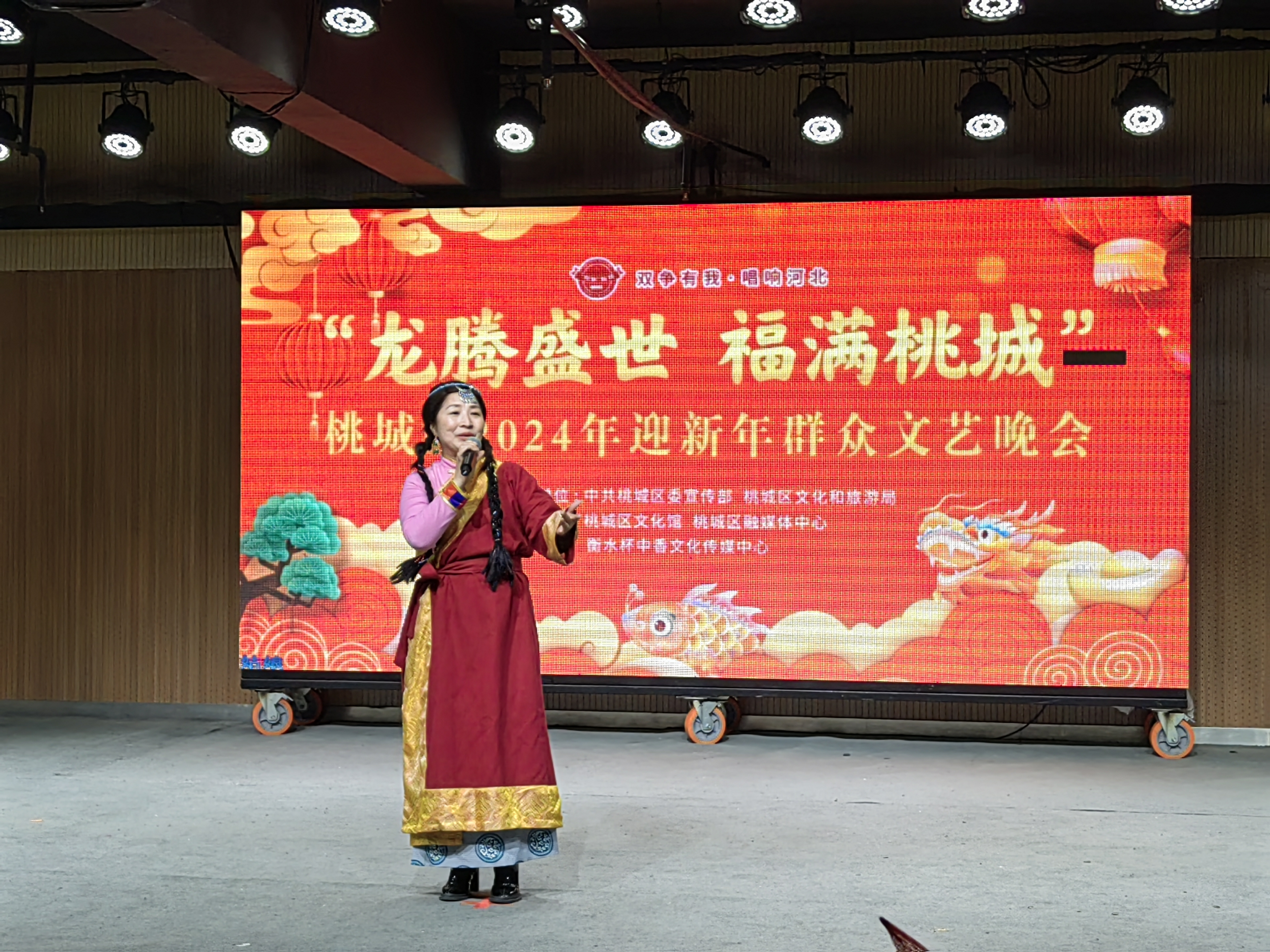 12月25日,“龙腾盛世 福满桃城”桃城区2024迎新年群众文艺晚会在桃城区文化馆多功能厅举办。晚会在开场舞《开门红》中正式拉开帷幕。男女声二重唱《幸福中国一起走》、葫芦丝合奏《映山红》、河北梆子《我生在庄稼院儿》等节目轮番上演,表达了群众对幸福生活的美好向往,展示了人民群众浓厚的家国情怀、昂扬的精神风貌和坚定的文化自信。